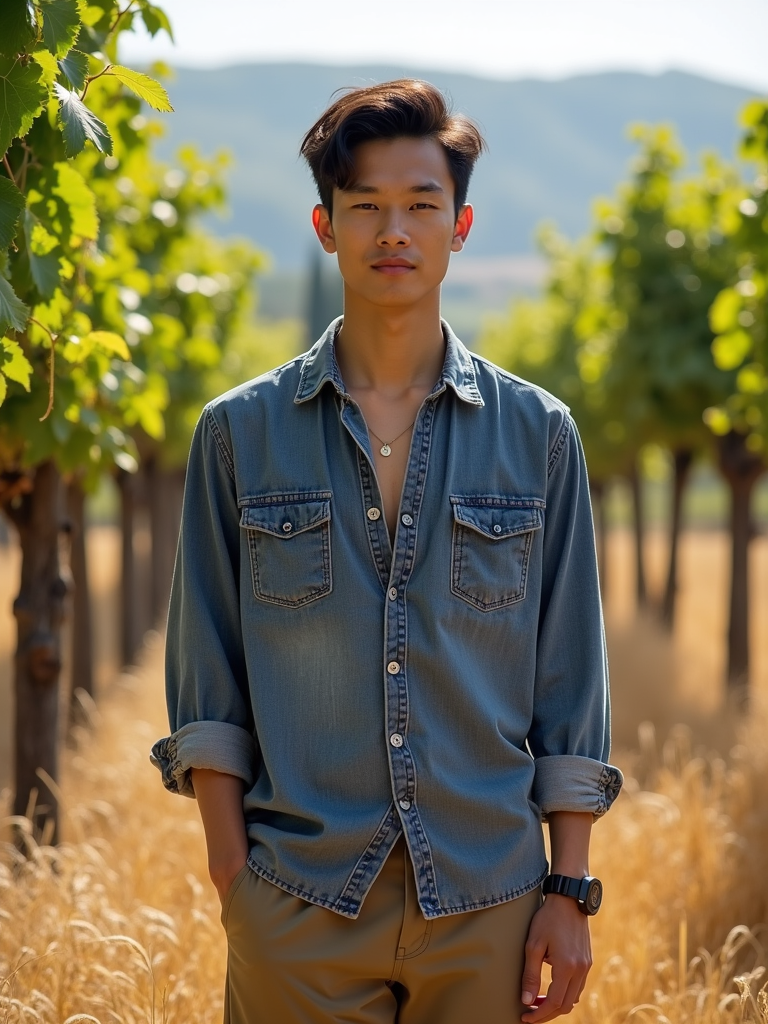model in a rustic vineyard in Tuscany, wearing casual elegant attire with European blue details, standing beneath hanging grape vines, golden wheat fields and cypress trees visible in the background, embodying European rural charm