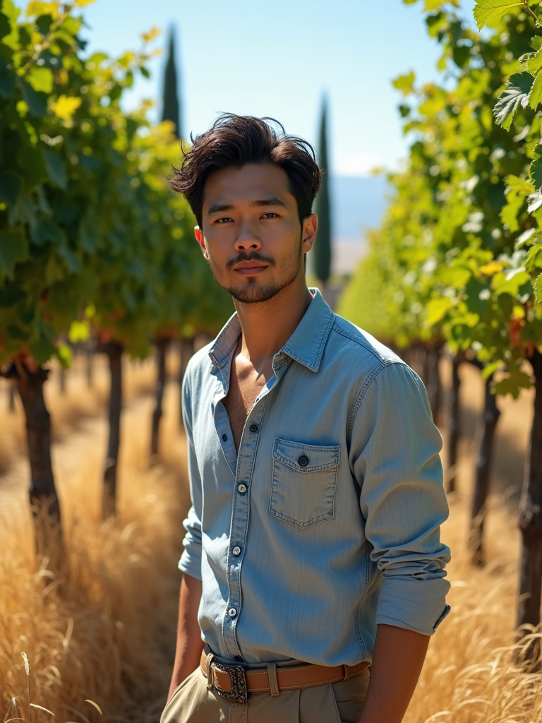 model in a rustic vineyard in Tuscany, wearing casual elegant attire with European blue details, standing beneath hanging grape vines, golden wheat fields and cypress trees visible in the background, embodying European rural charm