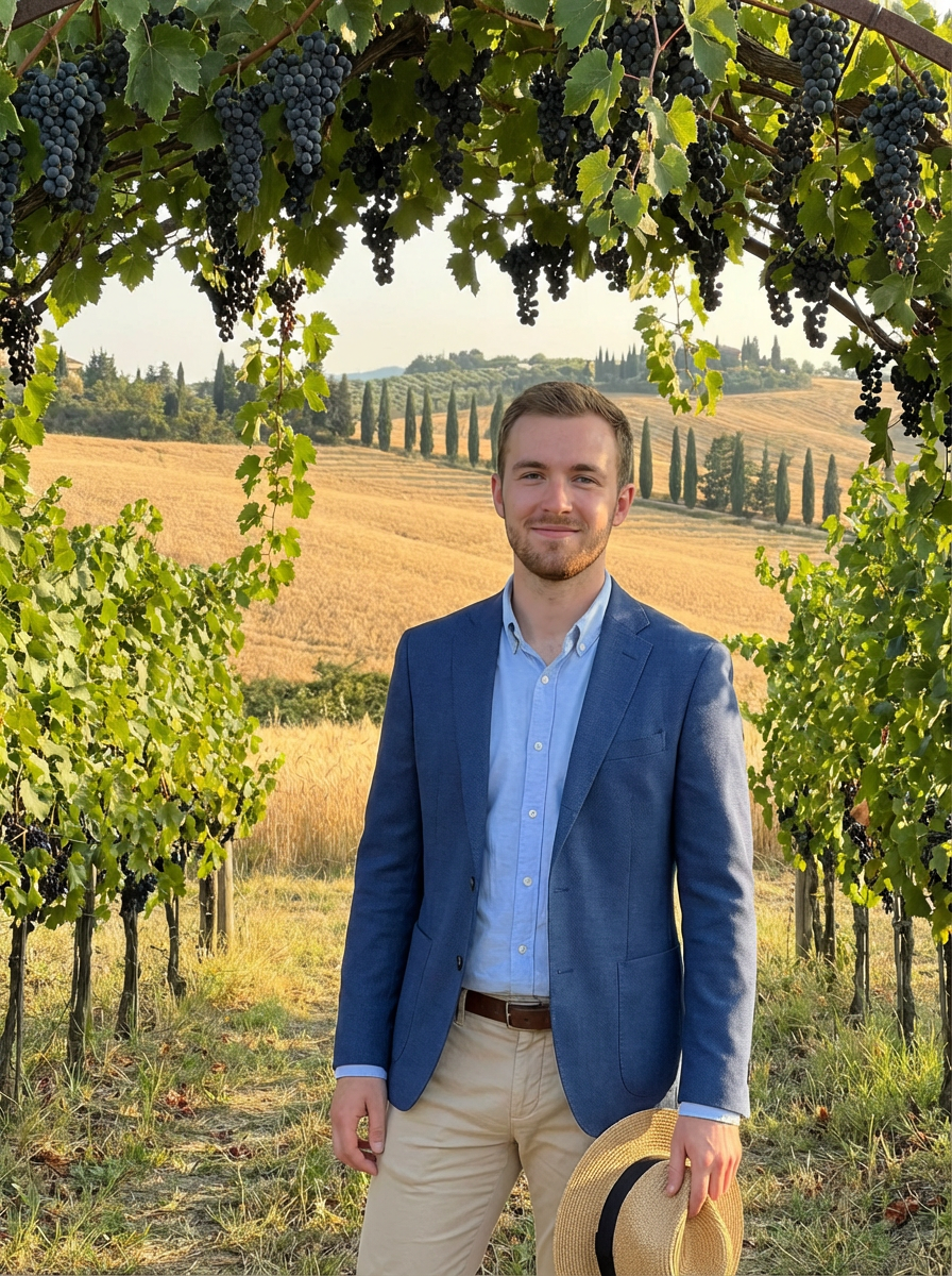 model in a rustic vineyard in Tuscany, wearing casual elegant attire with European blue details, standing beneath hanging grape vines, golden wheat fields and cypress trees visible in the background, embodying European rural charm