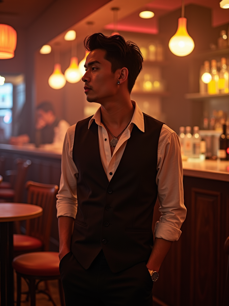 model in a stylish lounge bar with a glamorous ambiance. at night. the model is dressed in a chic ensemble, like a dress shirt with a vest and trousers, enjoying the upscale setting.