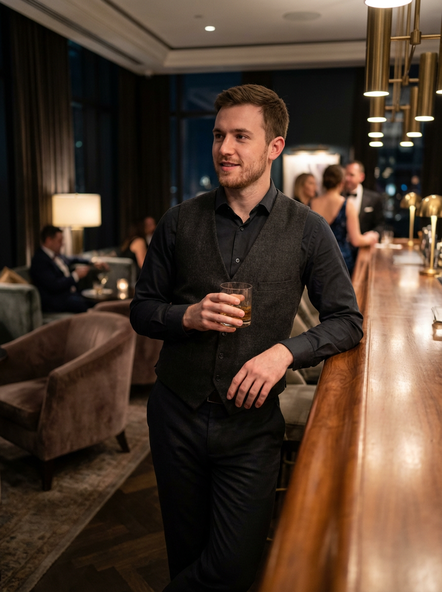 model in a stylish lounge bar with a glamorous ambiance. at night. the model wears a dress shirt with a vest and trousers.