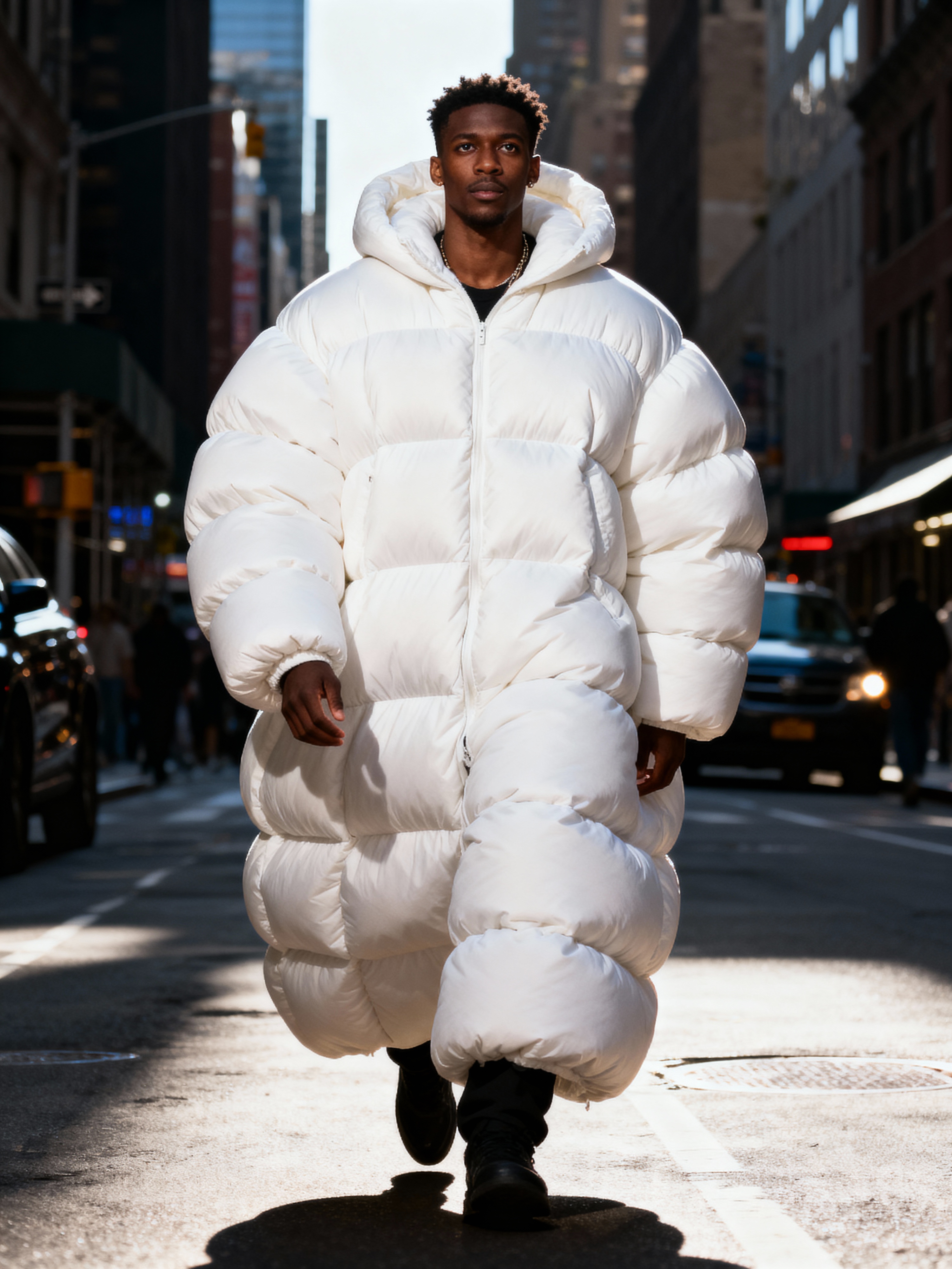 Related photosside view of woman in a super big round white puffer closed coat with an exaggerated, voluminous design with oversized hood and thick, many quilted sections that contribute to its inflated appearance. the coat is closed and inflated. woman is walking outside in New York City street.woman in a super big round white puffer closed coat with an exaggerated, voluminous design with oversized hood and thick, many quilted sections that contribute to its inflated appearance. the coat is closed and inflated. woman is walking outside in New York City street.side view of man in a super big round white puffer closed coat with an exaggerated, voluminous design with oversized hood and thick, many quilted sections that contribute to its inflated appearance. the coat is closed and inflated. man is walking outside in New York City street.man as 17th Century French Kinghandsome and stylish man showcasing a unique windowpane check suit in a navy blue color with a patterned shirt and a contrasting bow tiestylish and chic  woman in Mumbai wearing a contemporary fusion outfit, bustling streets of Mumbai in the background