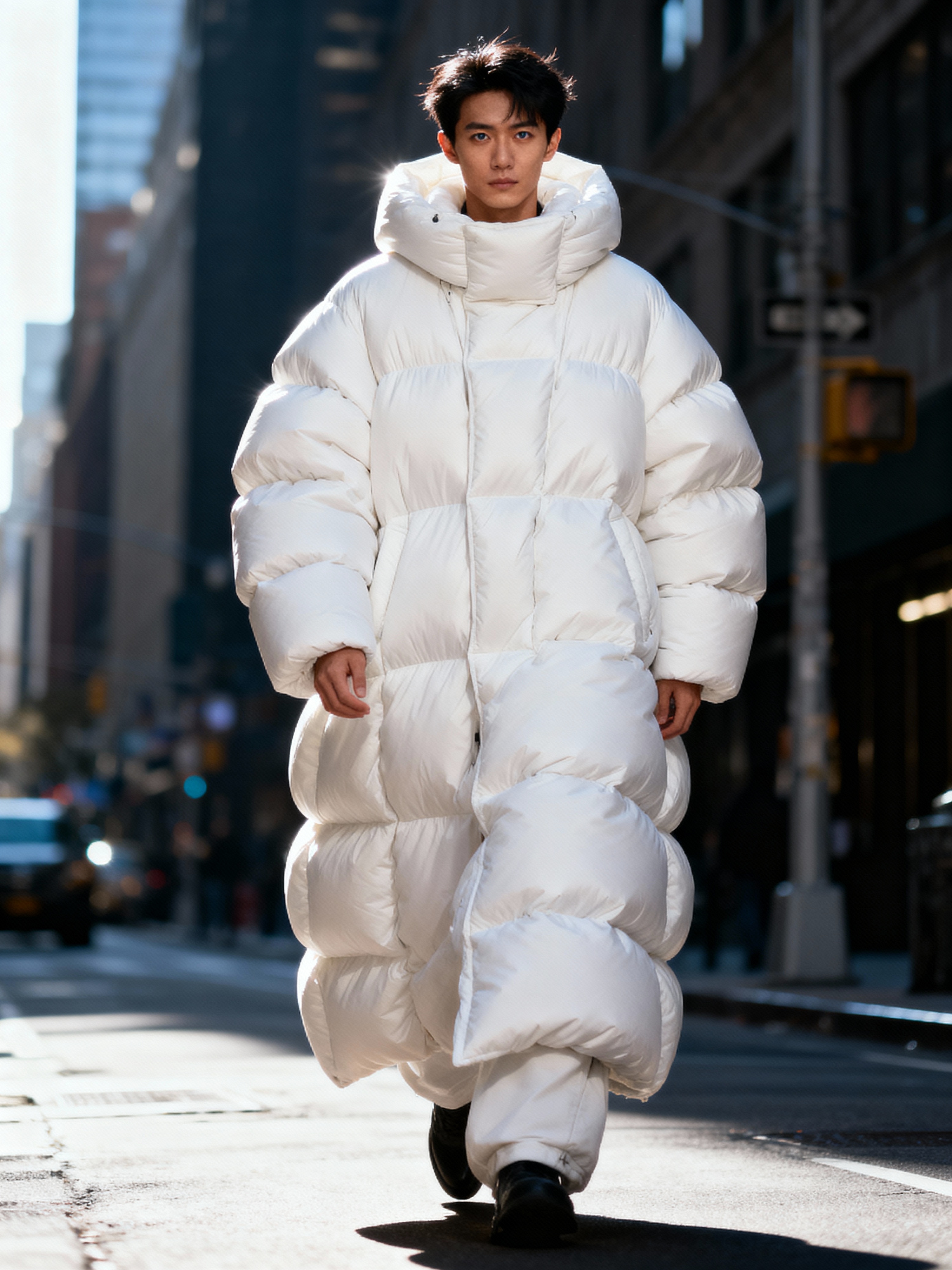model in a super big round white puffer closed coat with an exaggerated, voluminous design with oversized hood and thick, many quilted sections that contribute to its inflated appearance. the coat is closed and inflated. model is walking outside in New York City street.