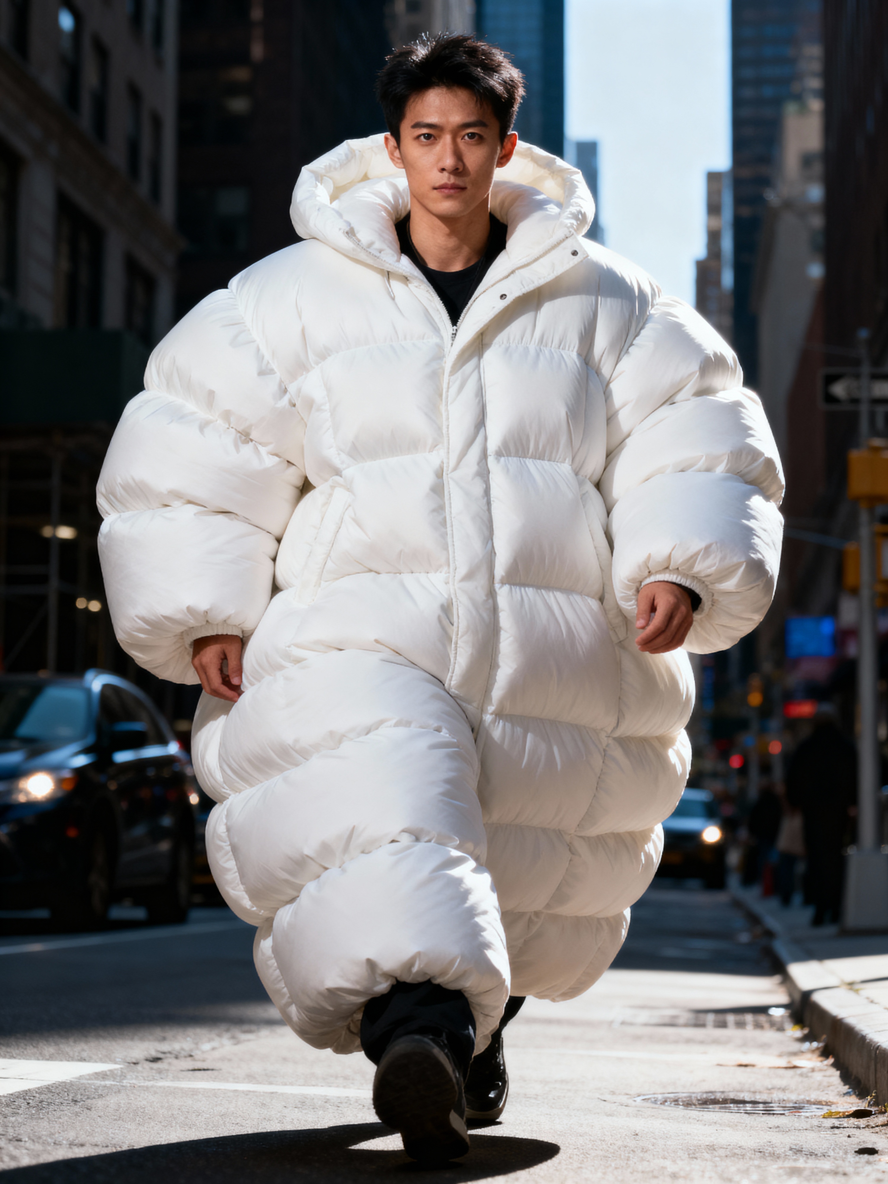 Related photosside view of woman in a super big round white puffer closed coat with an exaggerated, voluminous design with oversized hood and thick, many quilted sections that contribute to its inflated appearance. the coat is closed and inflated. woman is walking outside in New York City street.woman in a super big round white puffer closed coat with an exaggerated, voluminous design with oversized hood and thick, many quilted sections that contribute to its inflated appearance. the coat is closed and inflated. woman is walking outside in New York City street.side view of man in a super big round white puffer closed coat with an exaggerated, voluminous design with oversized hood and thick, many quilted sections that contribute to its inflated appearance. the coat is closed and inflated. man is walking outside in New York City street.a man in a festival-inspired outfit, dancing with  a crowd of fellow festival-goers, capturing the energetic and lively atmospherea man in  a sleeveless shirt and cargo pants, embodying the free-spirited and carefree nature of a music festivalsharp and trendy man in London wearing a checkered suit, Big Ben in the background