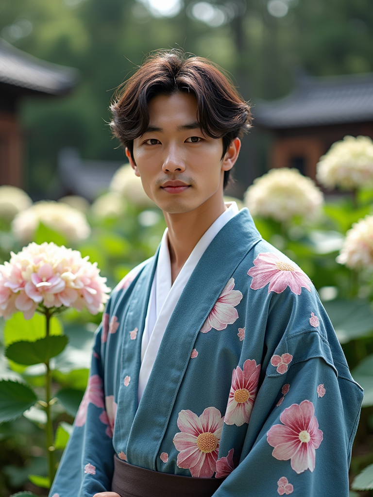 model in a traditional Japanese garden, wearing a modern yukata-inspired outfit, surrounded by blooming hydrangeas