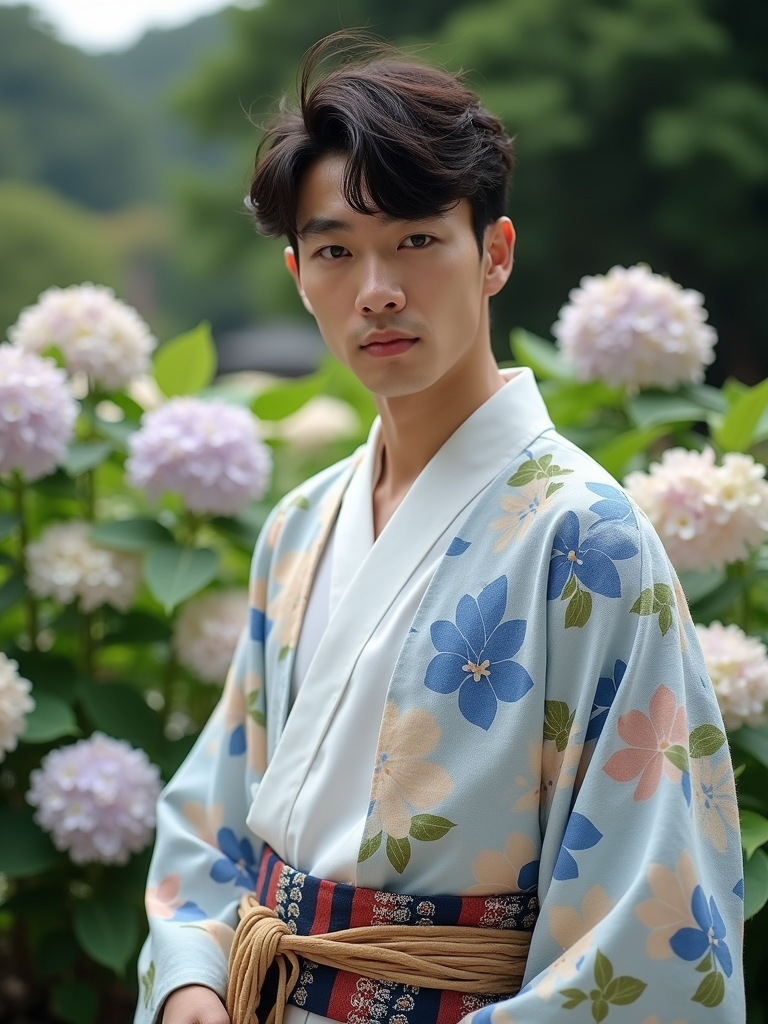 model in a traditional Japanese garden, wearing a modern yukata-inspired outfit, surrounded by blooming hydrangeas