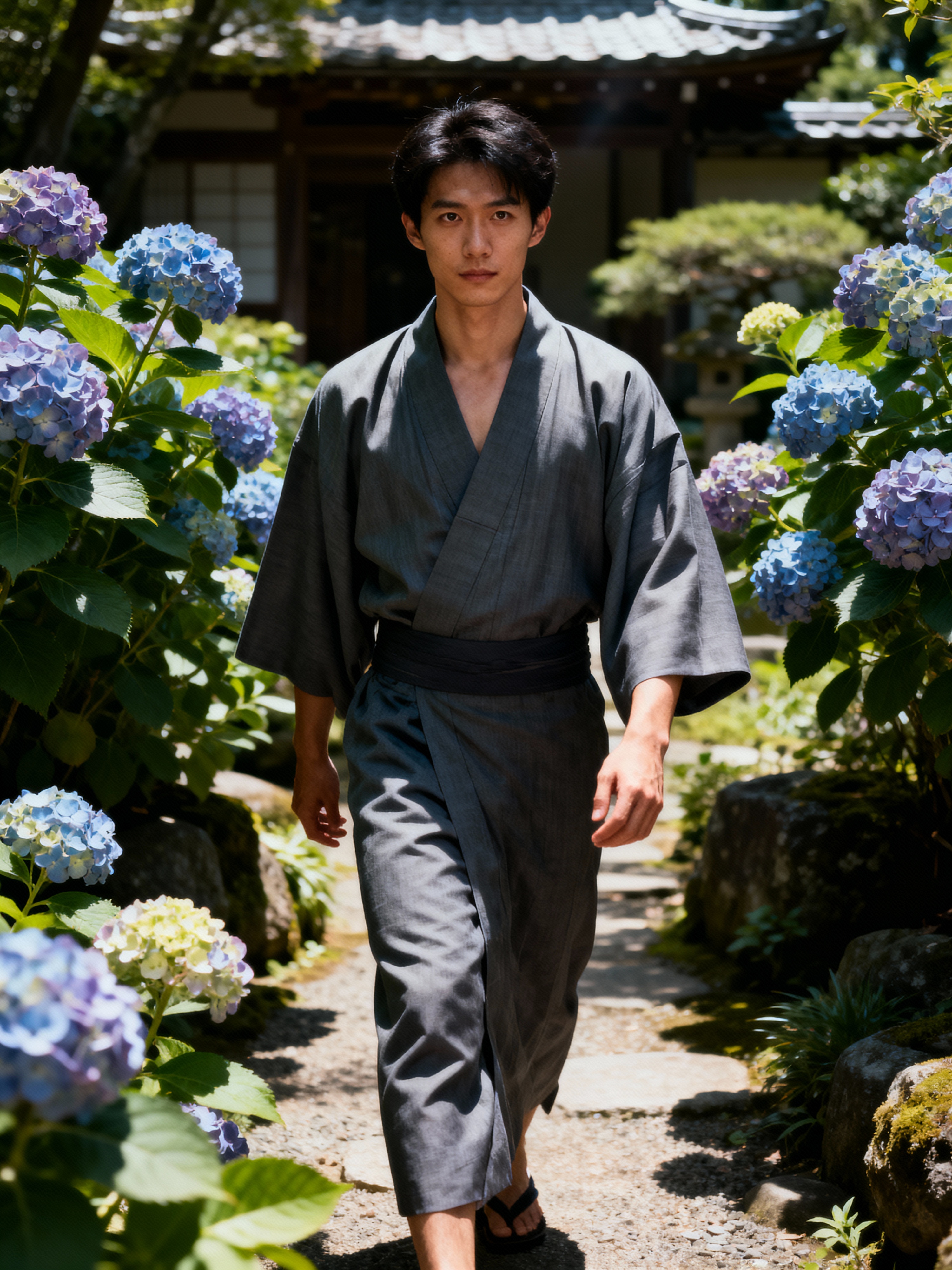 model in a traditional Japanese garden, wearing a modern yukata-inspired outfit, surrounded by blooming hydrangeas