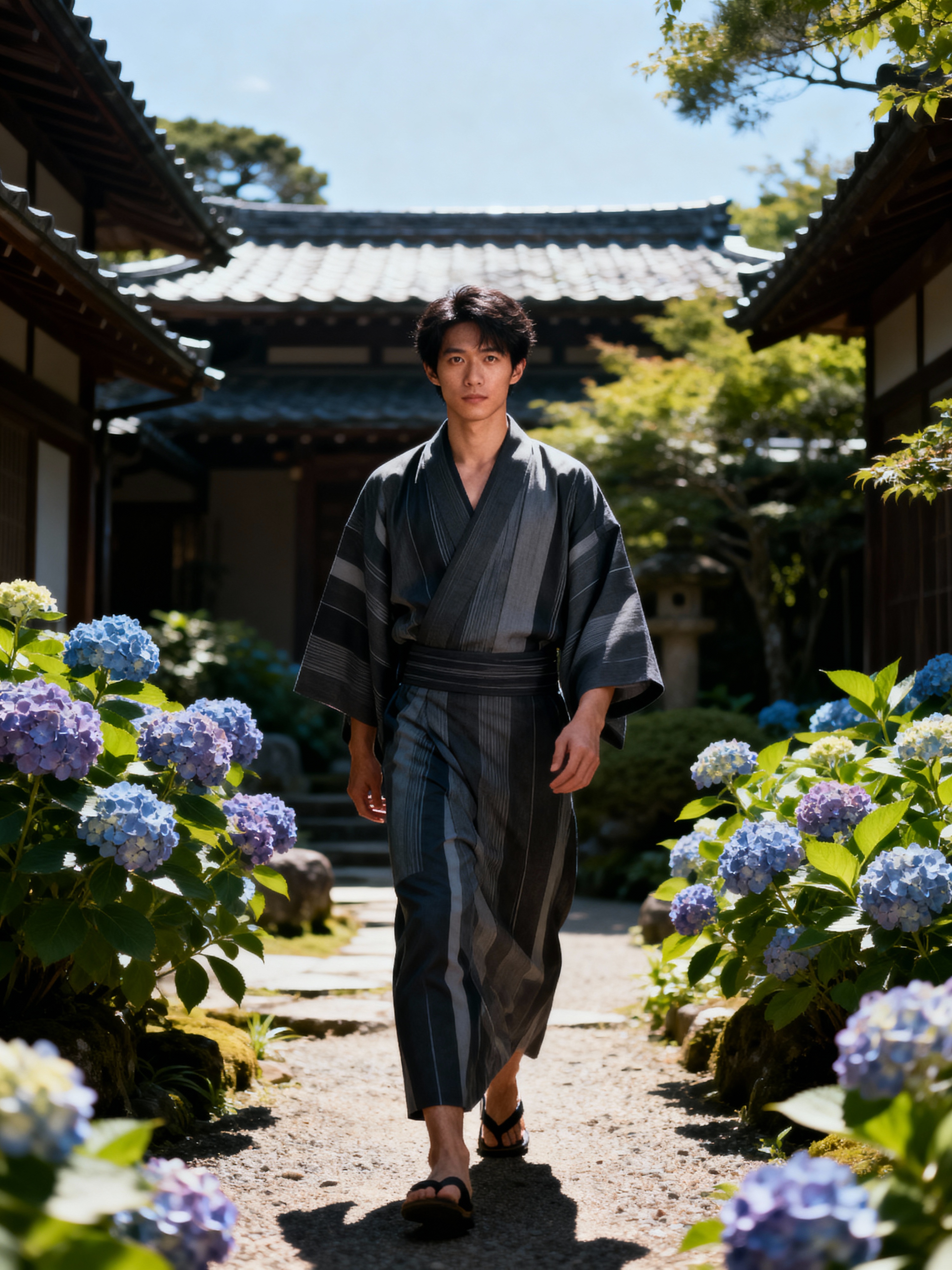 model in a traditional Japanese garden, wearing a modern yukata-inspired outfit, surrounded by blooming hydrangeas