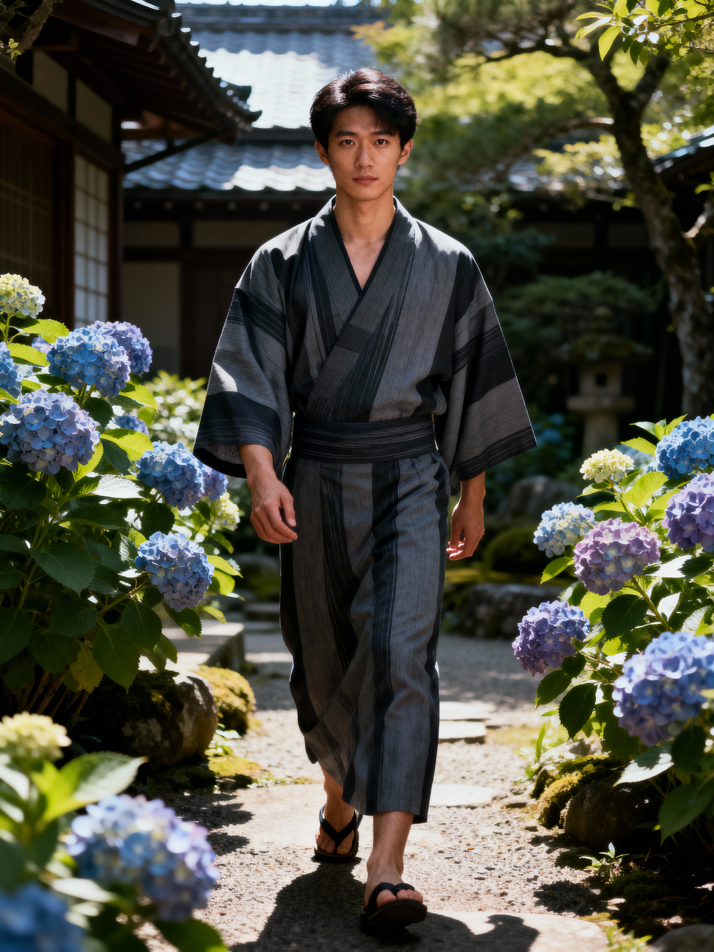 model in a traditional Japanese garden, wearing a modern yukata-inspired outfit, surrounded by blooming hydrangeas