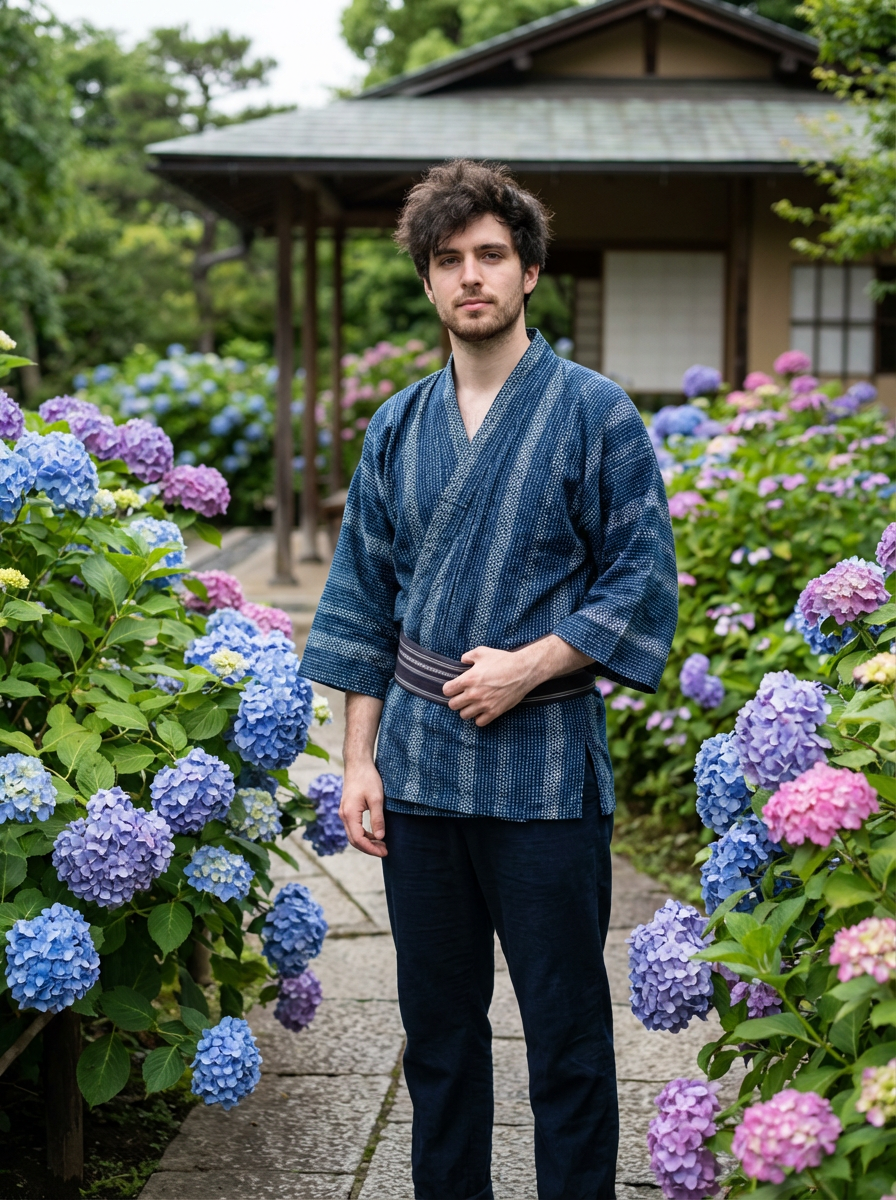 model in a traditional Japanese garden, wearing a modern yukata-inspired outfit, surrounded by blooming hydrangeas
