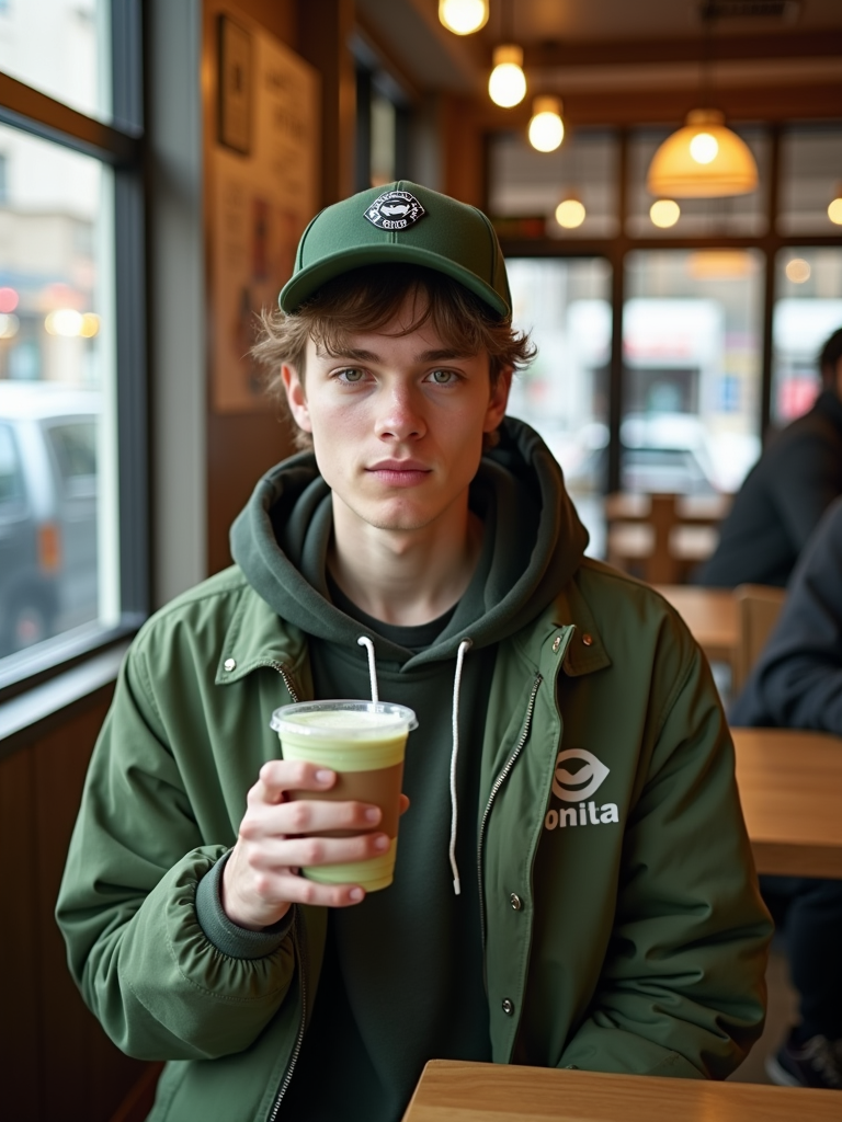 model in a trendy café in Harajuku, wearing streetwear with Japanese brand logos, drinking matcha latte