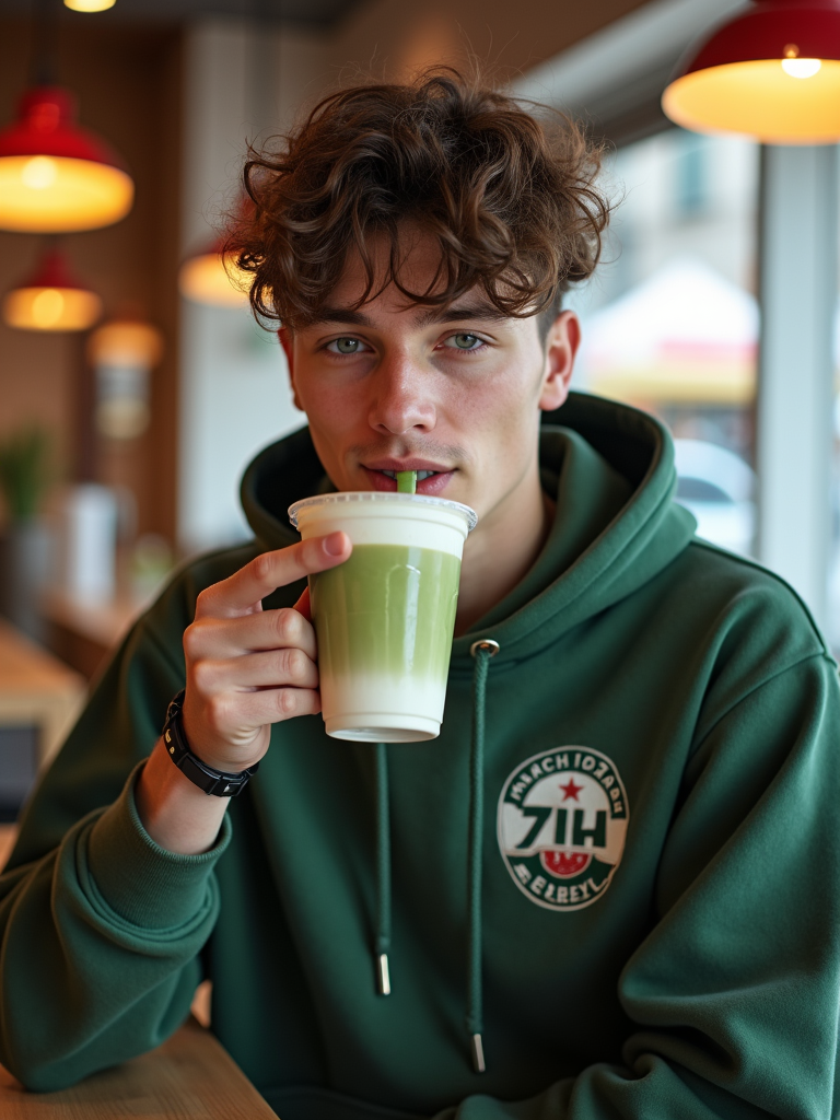 model in a trendy café in Harajuku, wearing streetwear with Japanese brand logos, drinking matcha latte