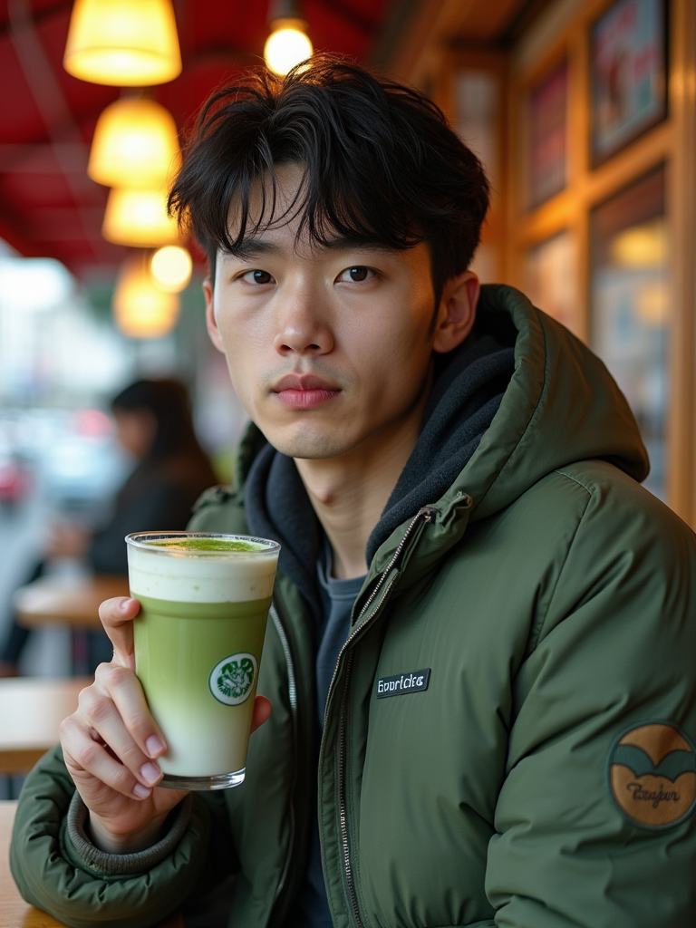 model in a trendy café in Harajuku, wearing streetwear with Japanese brand logos, drinking matcha latte