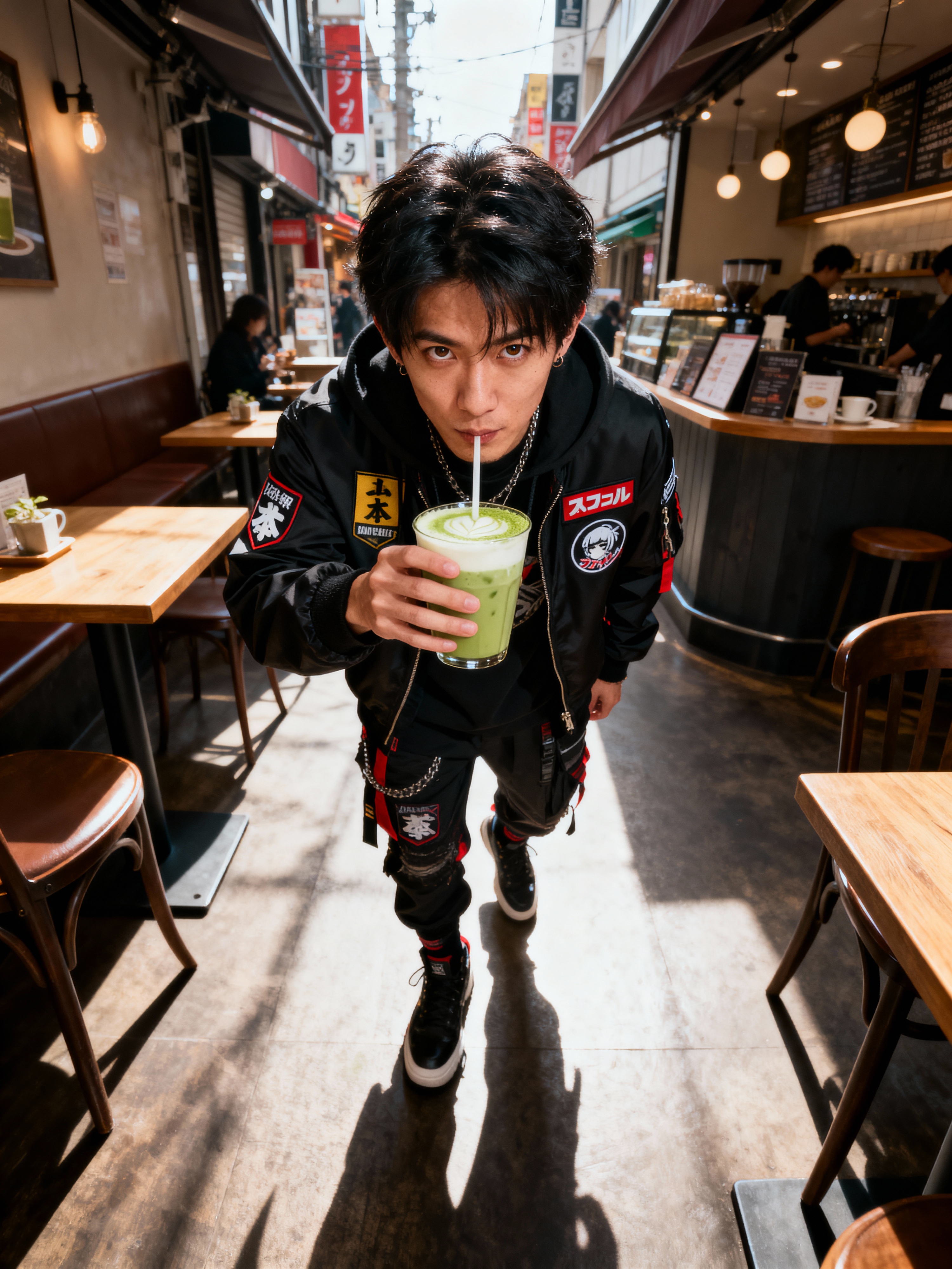 model in a trendy café in Harajuku, wearing streetwear with Japanese brand logos, drinking matcha latte