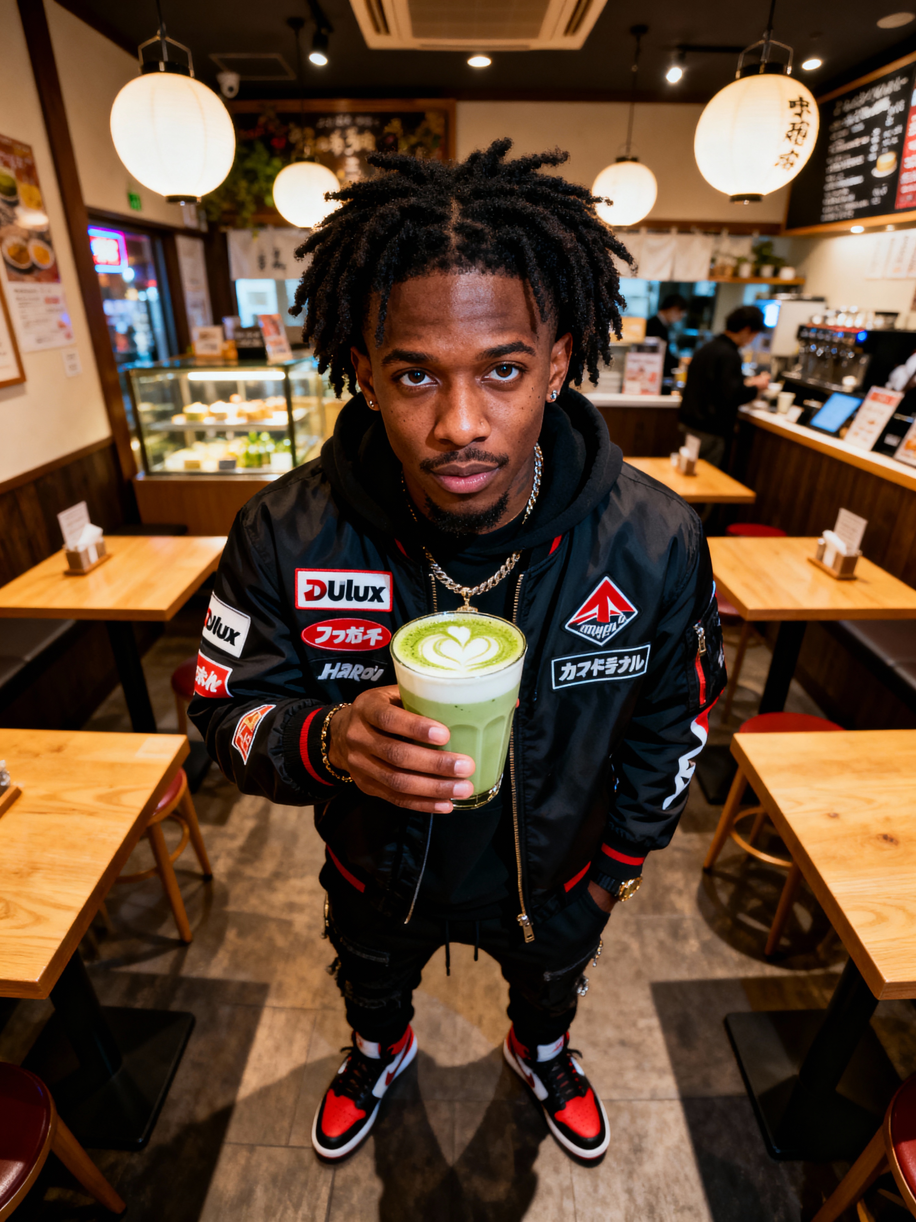 model in a trendy café in Harajuku, wearing streetwear with Japanese brand logos, drinking matcha latte
