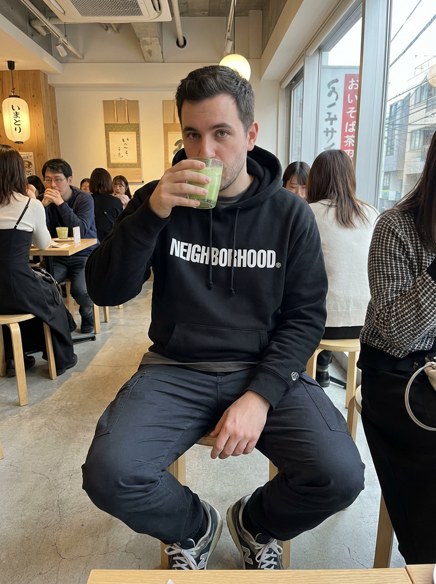 model in a trendy café in Harajuku, wearing streetwear with Japanese brand logos, drinking matcha latte