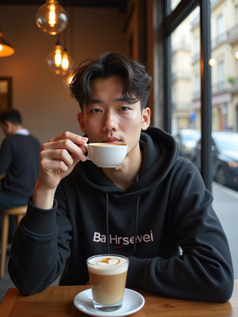 model in a trendy café in Le Marais, wearing streetwear with French brand logos, drinking café au lait