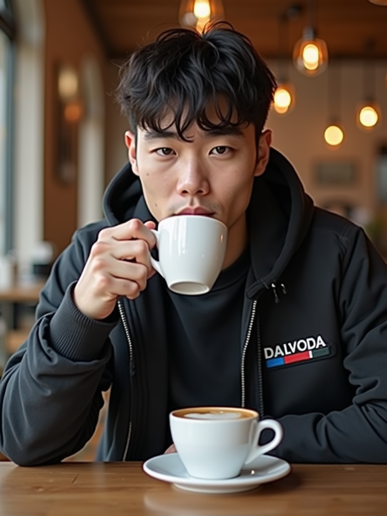model in a trendy café in Le Marais, wearing streetwear with French brand logos, drinking café au lait