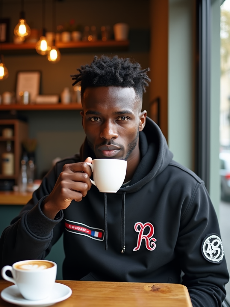 model in a trendy café in Le Marais, wearing streetwear with French brand logos, drinking café au lait