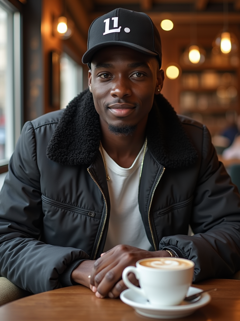 model in a trendy café in Le Marais, wearing streetwear with French brand logos, drinking café au lait