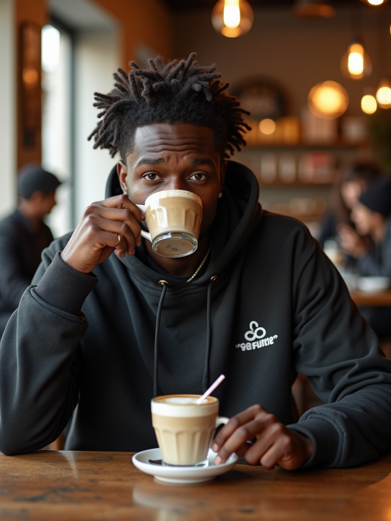 model in a trendy café in Le Marais, wearing streetwear with French brand logos, drinking café au lait
