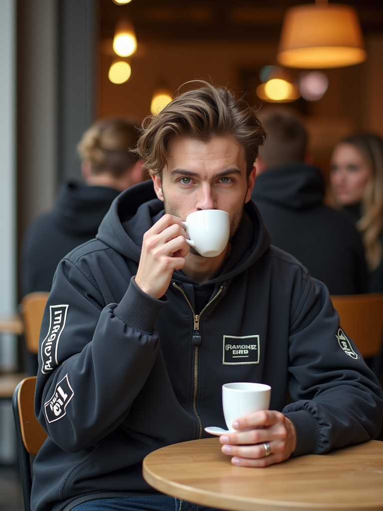 model in a trendy café in Le Marais, wearing streetwear with French brand logos, drinking café au lait