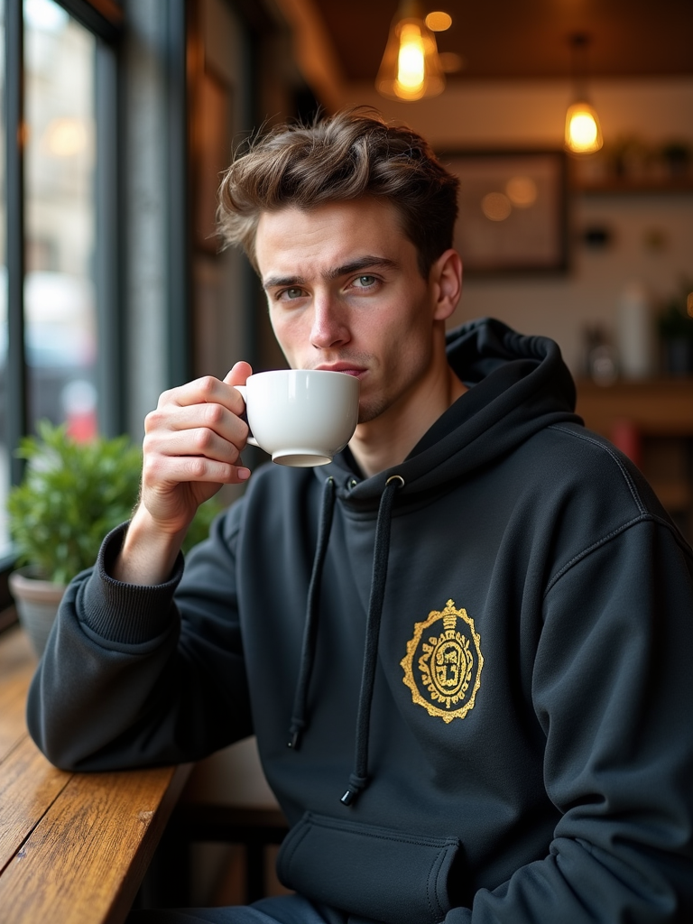 model in a trendy café in Le Marais, wearing streetwear with French brand logos, drinking café au lait