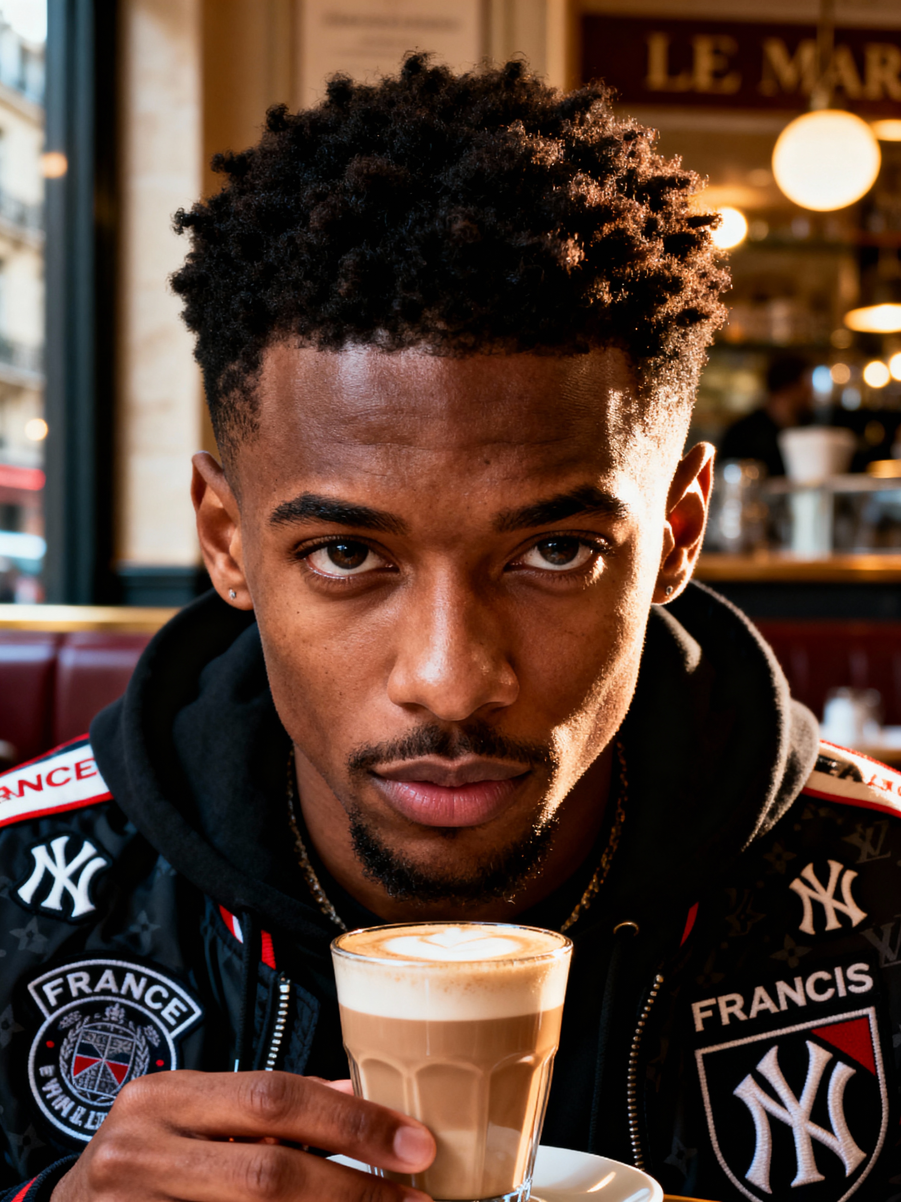 model in a trendy café in Le Marais, wearing streetwear with French brand logos, with a café au lait