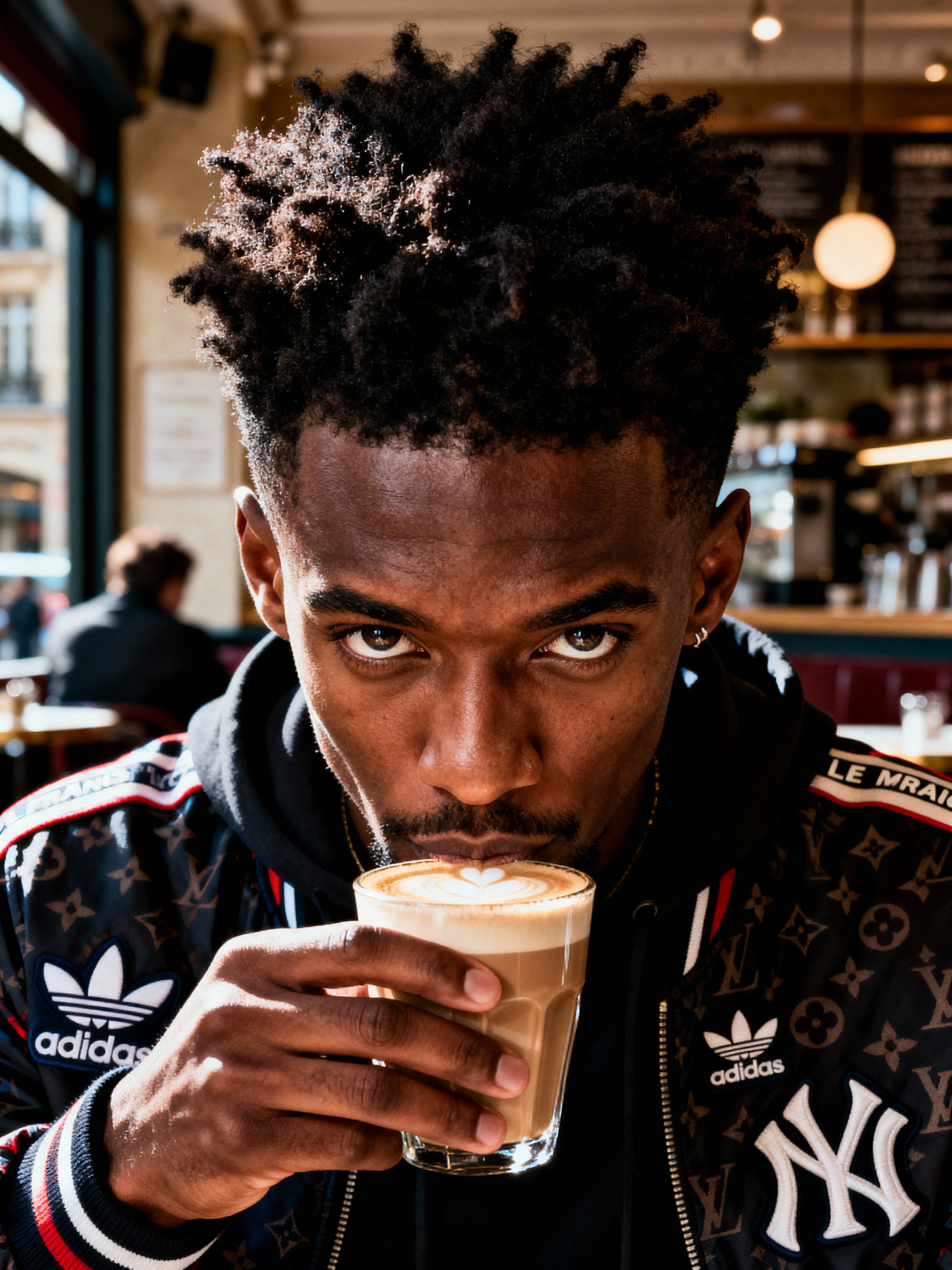 model in a trendy café in Le Marais, wearing streetwear with French brand logos, with a café au lait