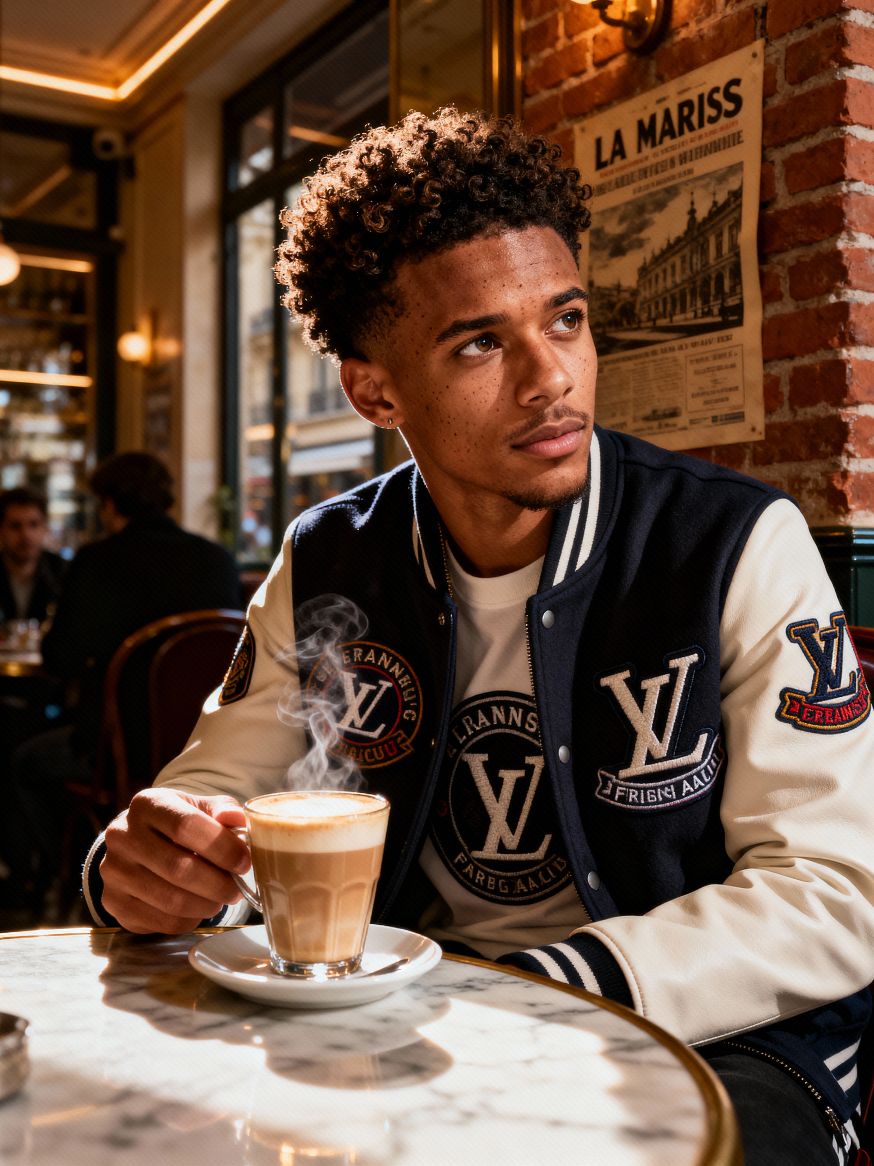 model in a trendy café in Le Marais, wearing streetwear with French brand logos, with a café au lait