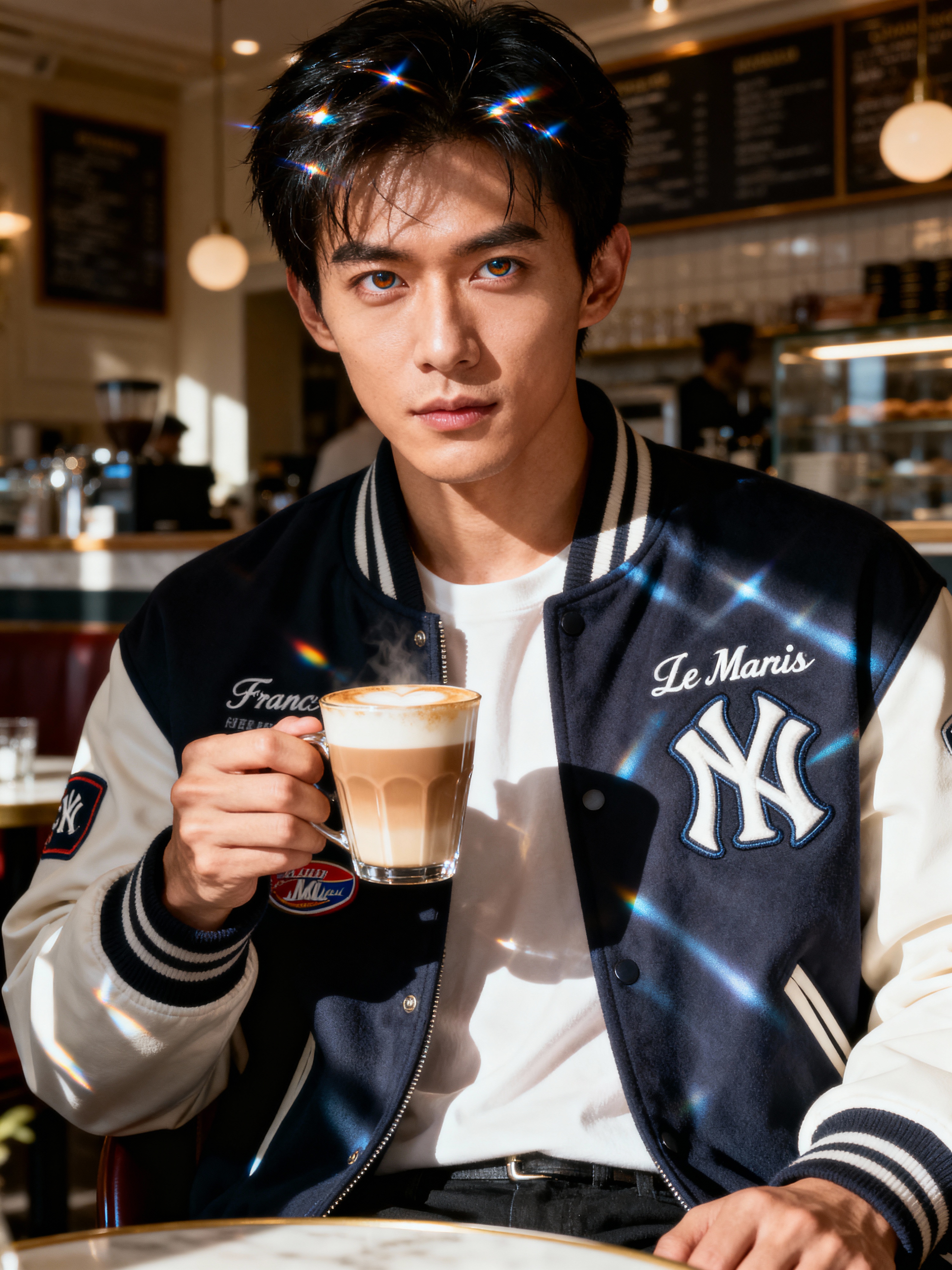 model in a trendy café in Le Marais, wearing streetwear with French brand logos, with a café au lait