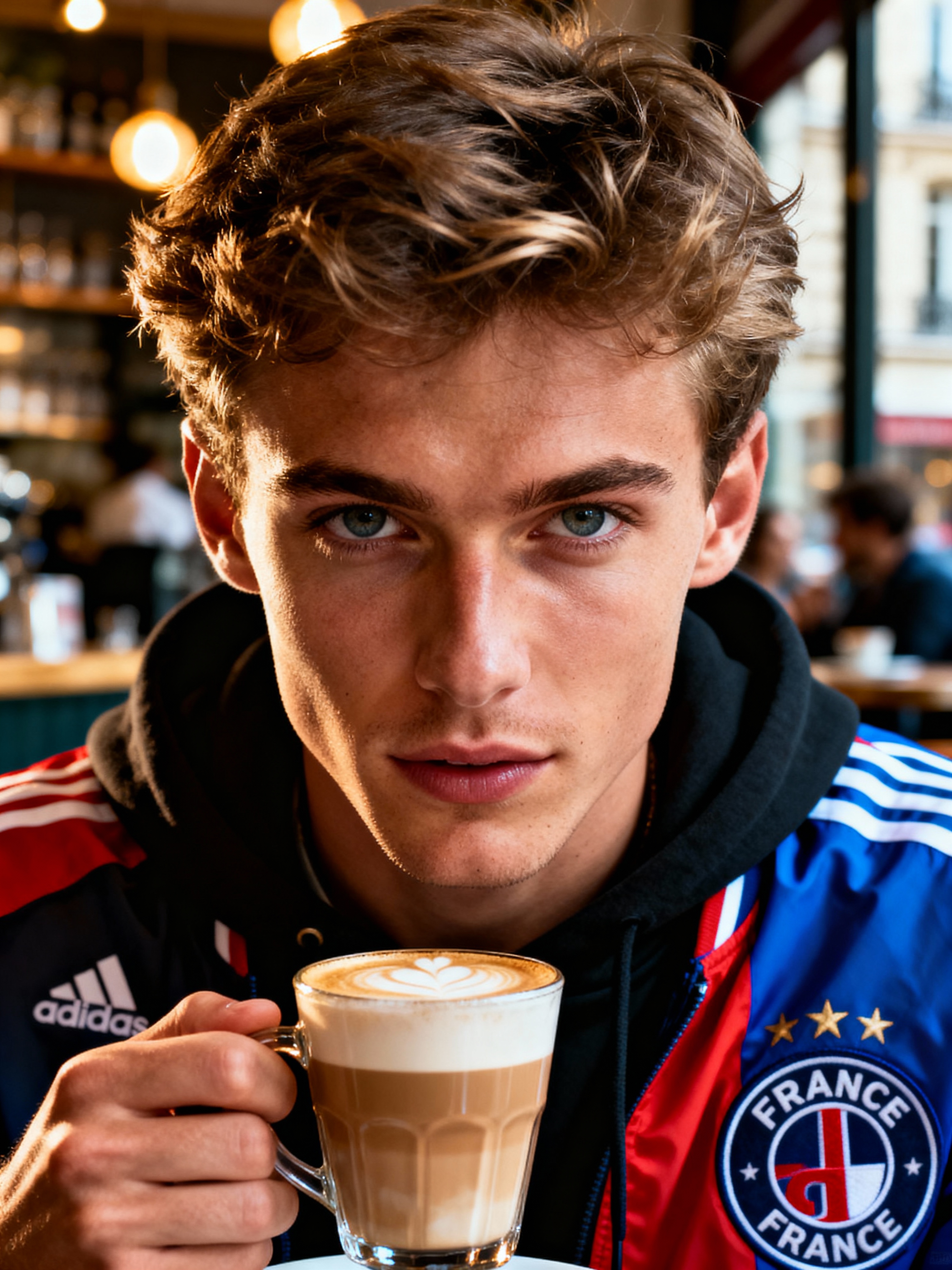 model in a trendy café in Le Marais, wearing streetwear with French brand logos, with a café au lait