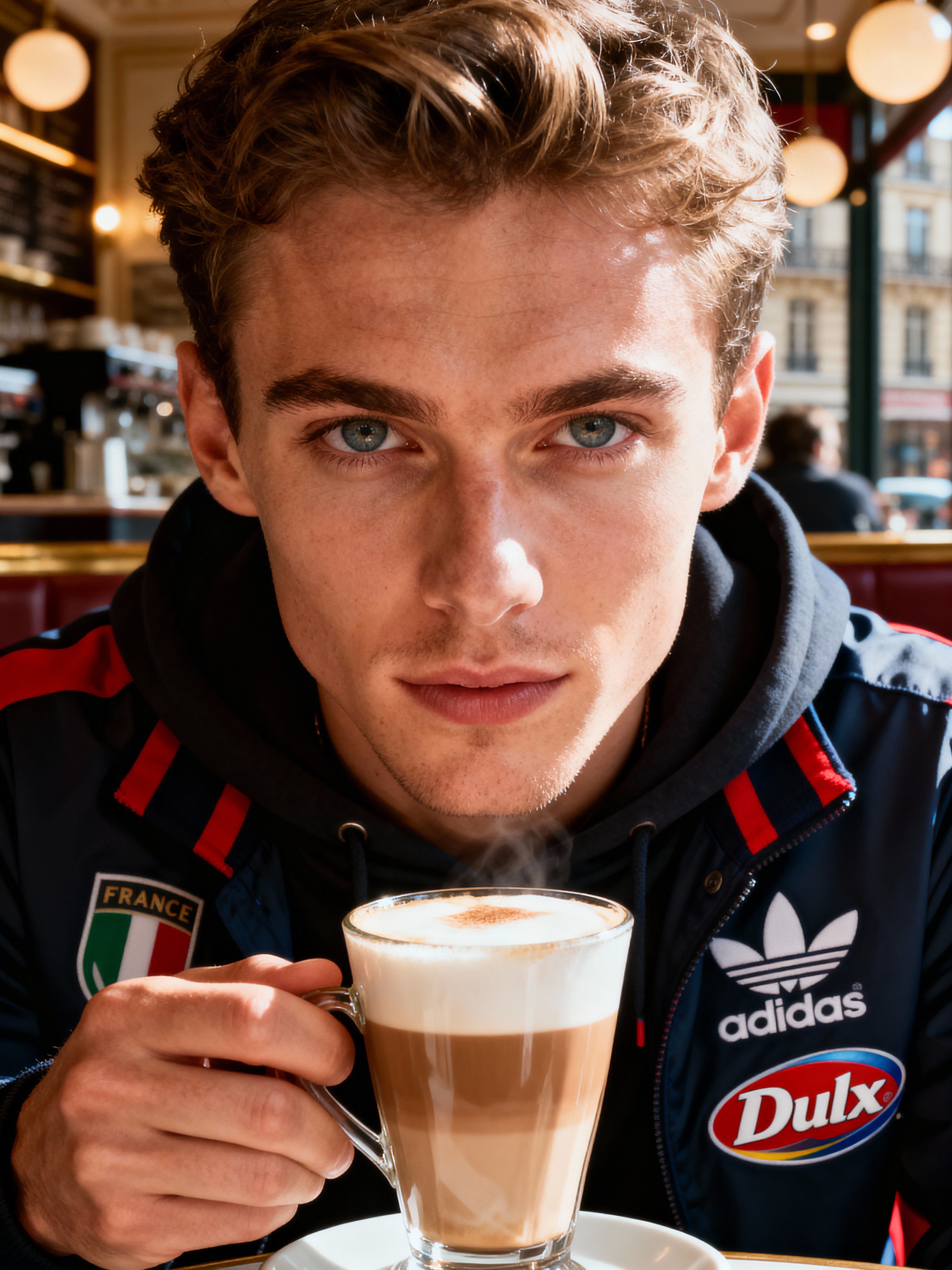 model in a trendy café in Le Marais, wearing streetwear with French brand logos, with a café au lait