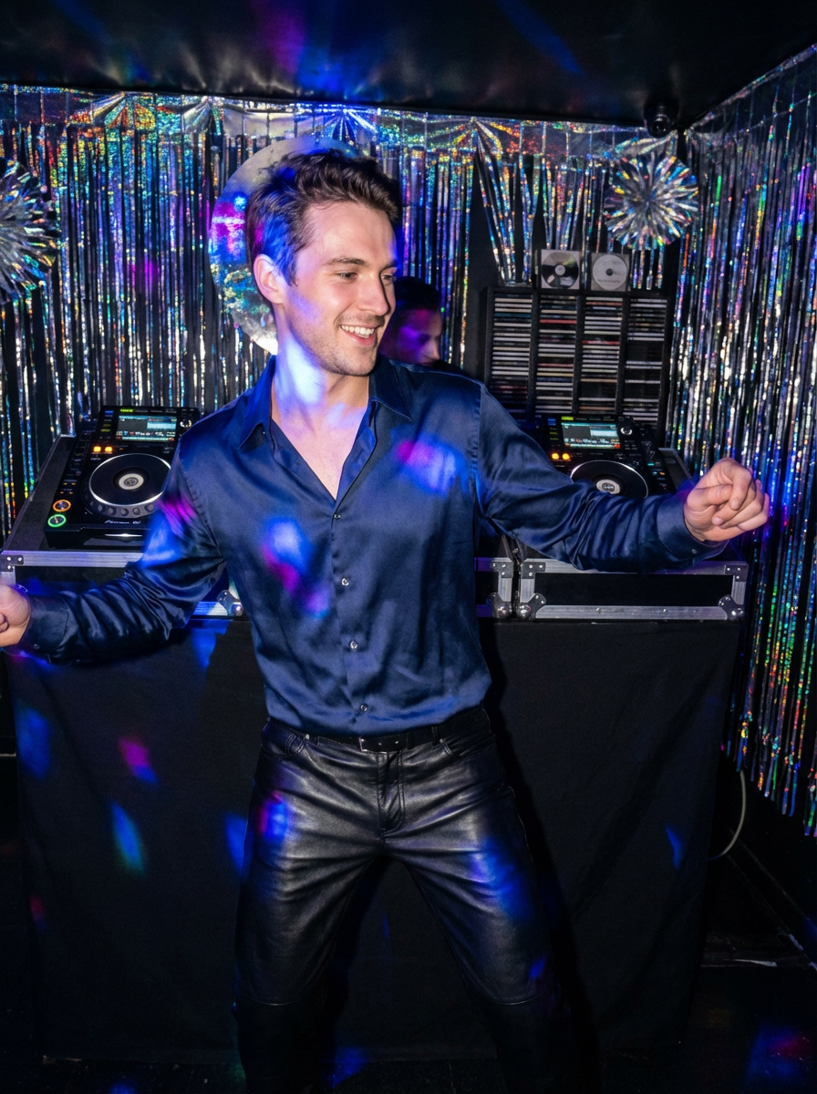 model in a typical 2000s club, wearing a silk shirt with leather pants, dancing under strobe lights, CDs displayed behind the DJ booth with dual CD players, metallic and holographic decorations on walls