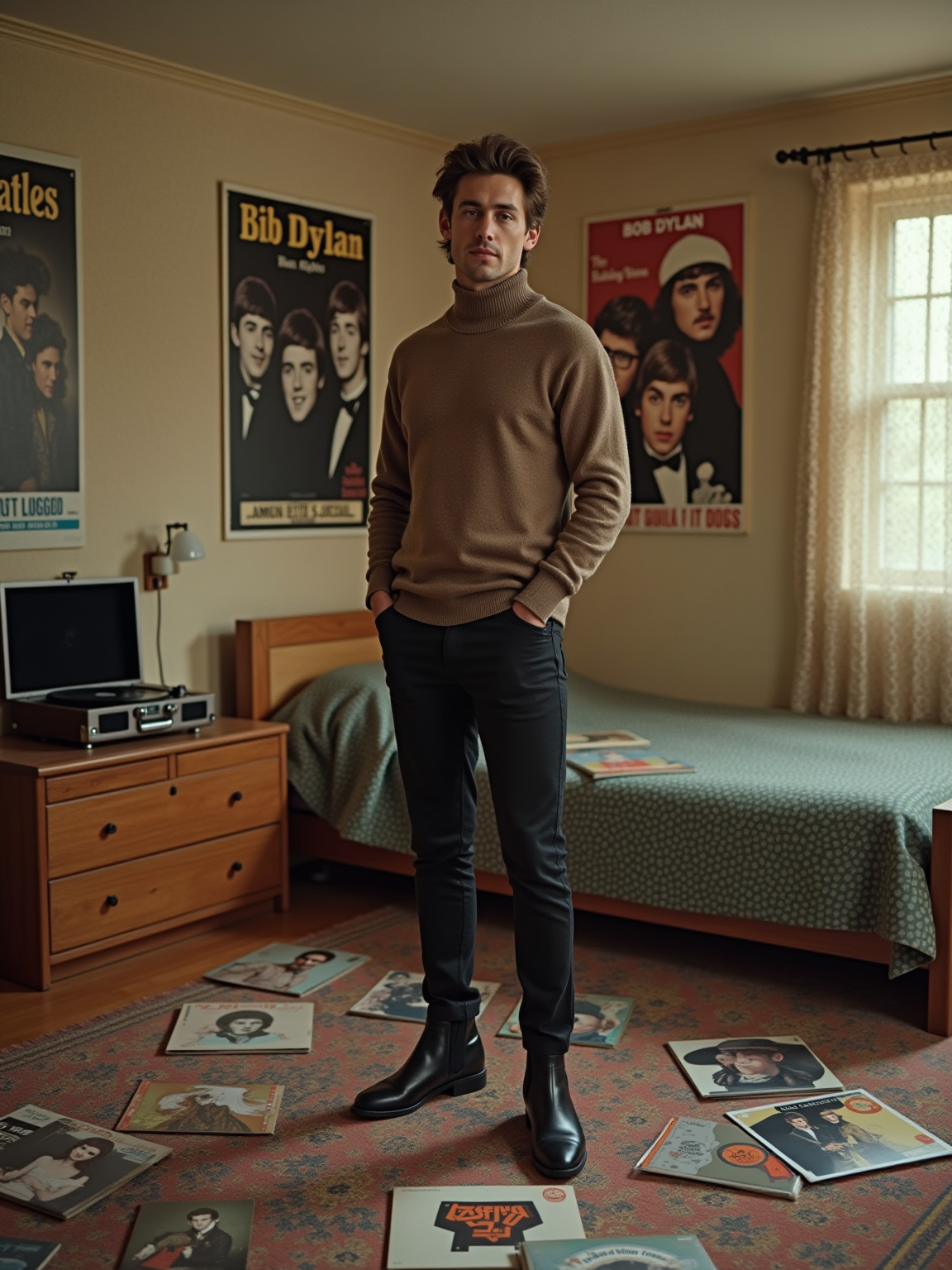 model in a typical 60s bedroom, wearing a turtleneck sweater with slim-fit pants and Chelsea boots, surrounded by scattered vinyl singles and album covers, posters of The Beatles, Rolling Stones, and Bob Dylan on the walls, portable record player with built-in speakers in background