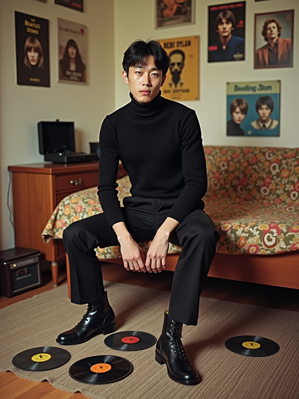model in a typical 60s bedroom, wearing a turtleneck sweater with slim-fit pants and Chelsea boots, surrounded by scattered vinyl singles and album covers, posters of The Beatles, Rolling Stones, and Bob Dylan on the walls, portable record player with built-in speakers in background