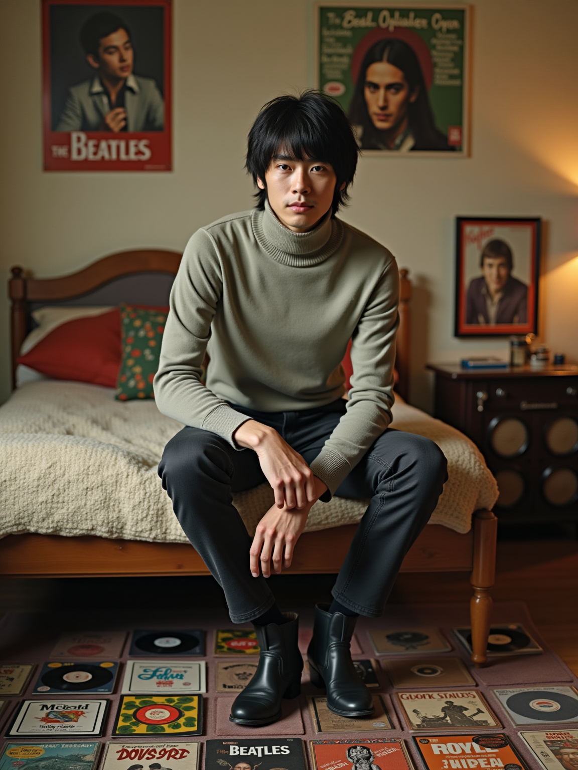 model in a typical 60s bedroom, wearing a turtleneck sweater with slim-fit pants and Chelsea boots, surrounded by scattered vinyl singles and album covers, posters of The Beatles, Rolling Stones, and Bob Dylan on the walls, portable record player with built-in speakers in background