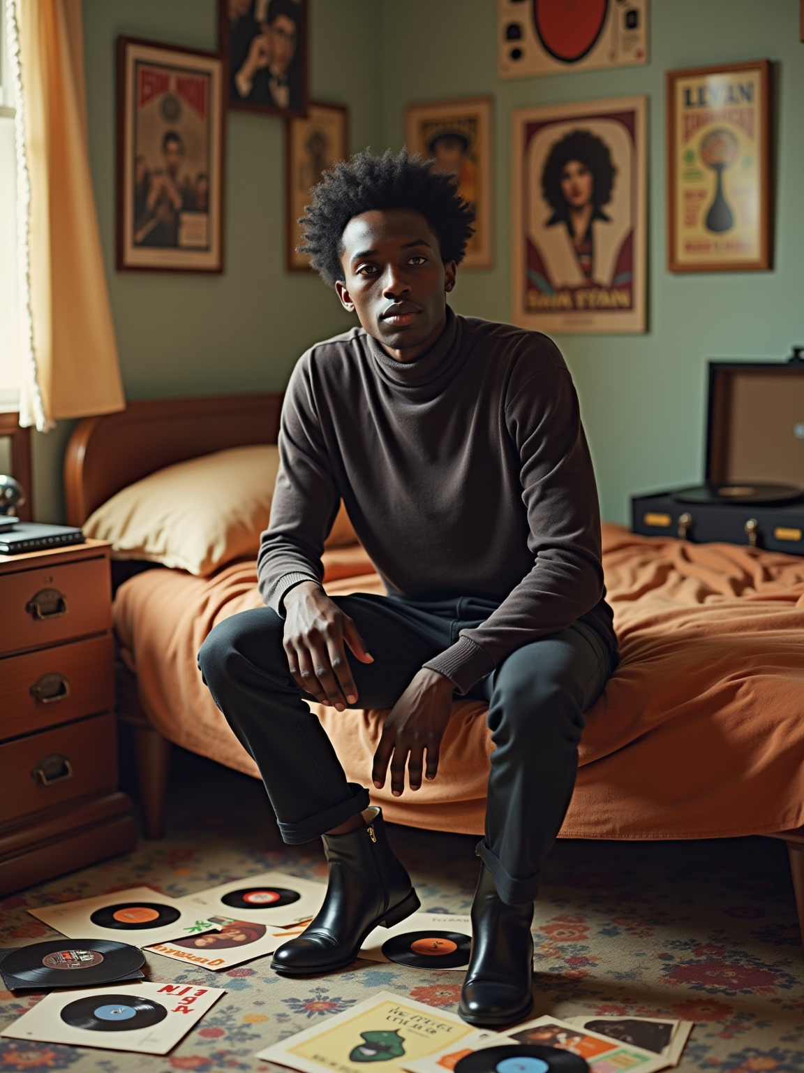 model in a typical 60s bedroom, wearing a turtleneck sweater with slim-fit pants and Chelsea boots, surrounded by scattered vinyl singles and album covers, posters of The Beatles, Rolling Stones, and Bob Dylan on the walls, portable record player with built-in speakers in background
