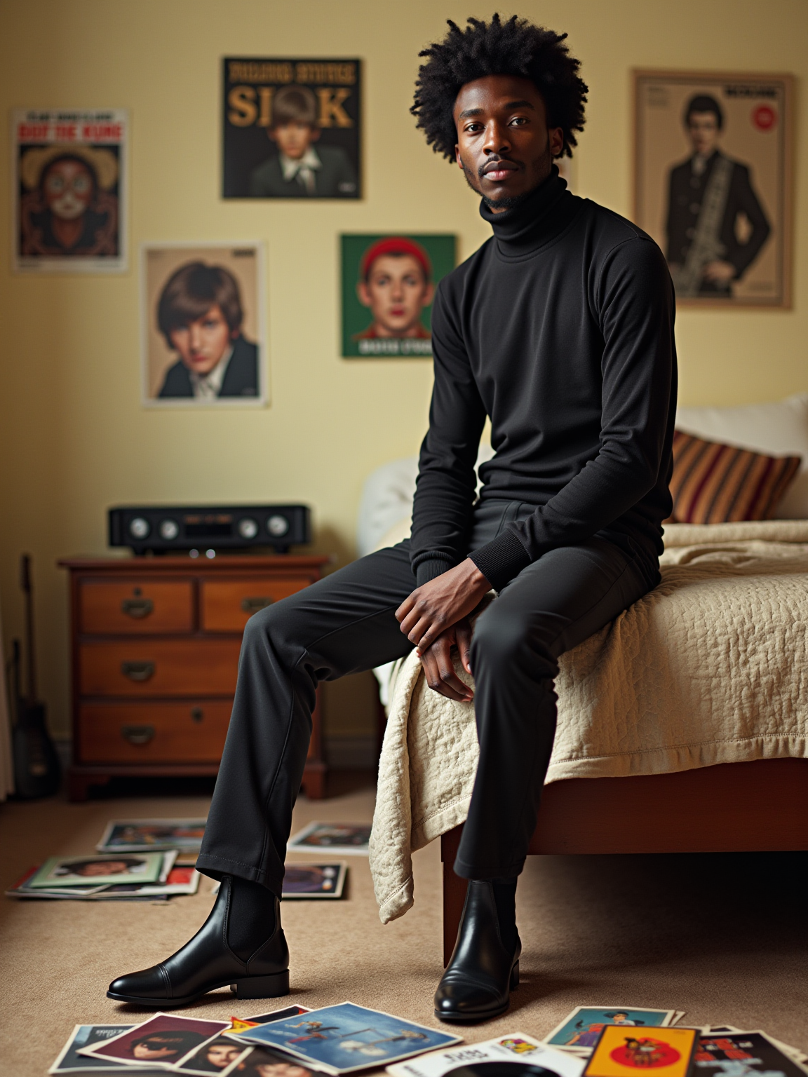 model in a typical 60s bedroom, wearing a turtleneck sweater with slim-fit pants and Chelsea boots, surrounded by scattered vinyl singles and album covers, posters of The Beatles, Rolling Stones, and Bob Dylan on the walls, portable record player with built-in speakers in background