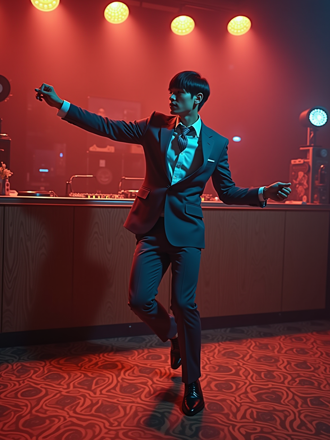 model in a typical 60s dance club, wearing a slim-fit suit with narrow lapels and skinny tie, dancing under colored spotlights, vinyl records displayed behind the DJ booth, mod geometric patterns on floor and walls