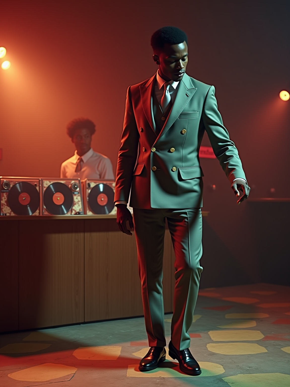 model in a typical 60s dance club, wearing a slim-fit suit with narrow lapels and skinny tie, dancing under colored spotlights, vinyl records displayed behind the DJ booth, mod geometric patterns on floor and walls