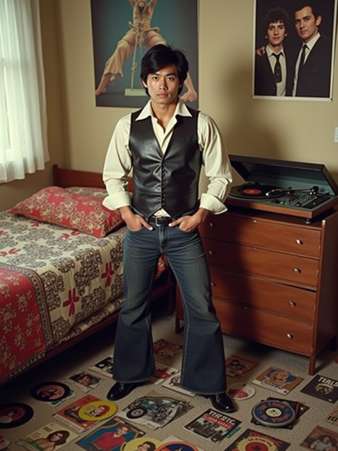 model in a typical 70s bedroom, wearing a wide-collar shirt with bell-bottom pants and leather vest, surrounded by scattered vinyl records and 8-track tapes, posters of 70s rock bands and disco stars on the walls, wood-grain stereo system with turntable in background