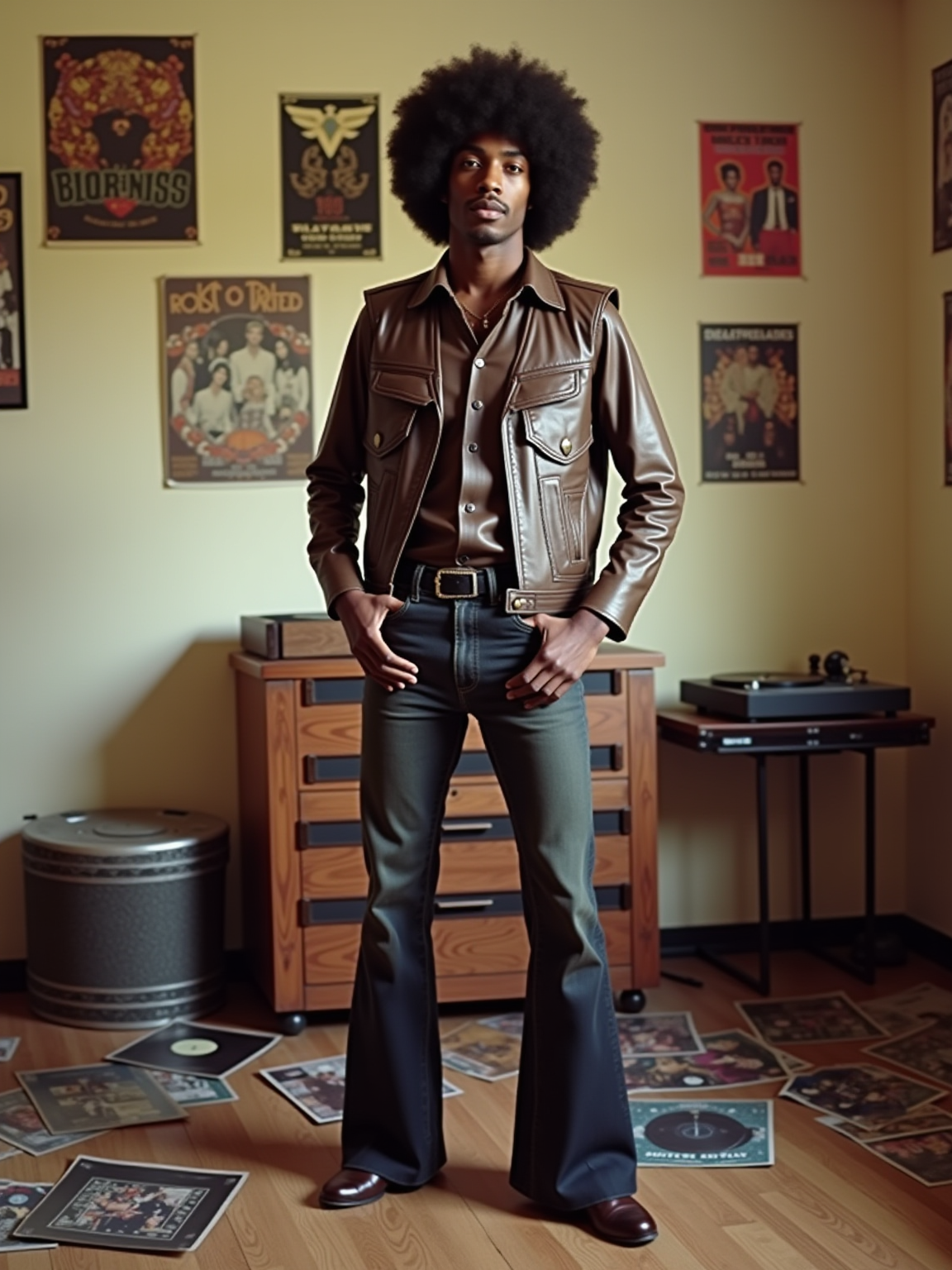 model in a typical 70s bedroom, wearing a wide-collar shirt with bell-bottom pants and leather vest, surrounded by scattered vinyl records and 8-track tapes, posters of 70s rock bands and disco stars on the walls, wood-grain stereo system with turntable in background