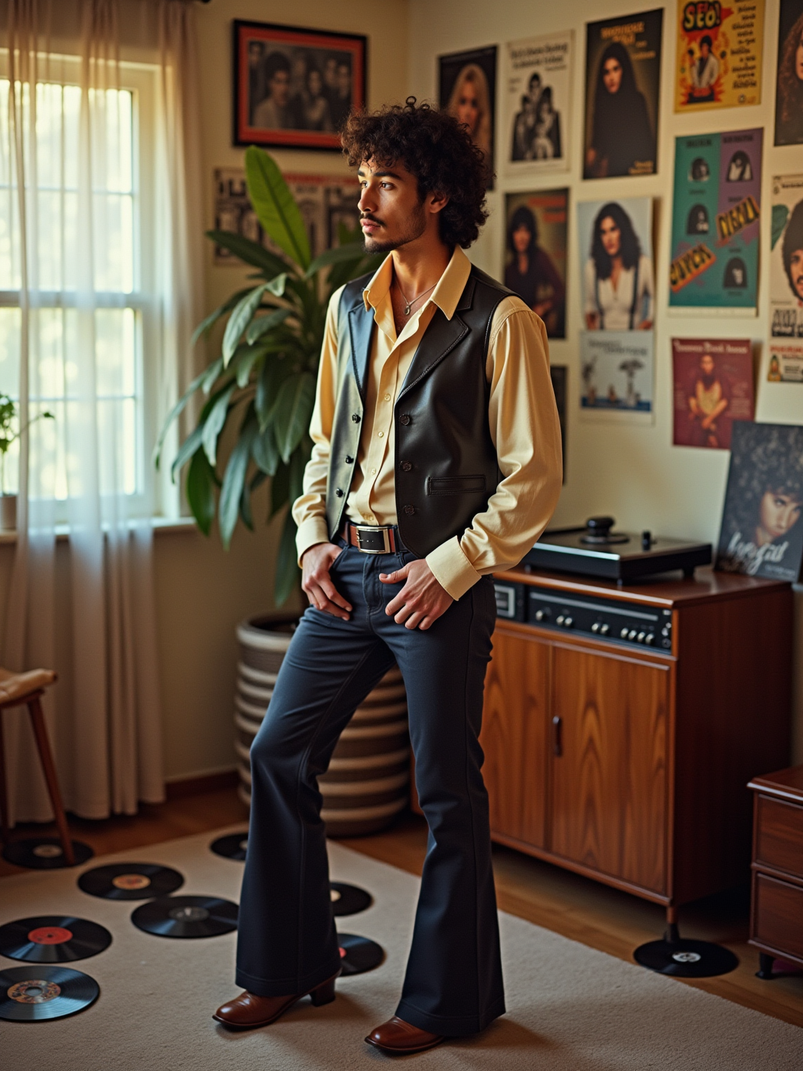model in a typical 70s bedroom, wearing a wide-collar shirt with bell-bottom pants and leather vest, surrounded by scattered vinyl records and 8-track tapes, posters of 70s rock bands and disco stars on the walls, wood-grain stereo system with turntable in background
