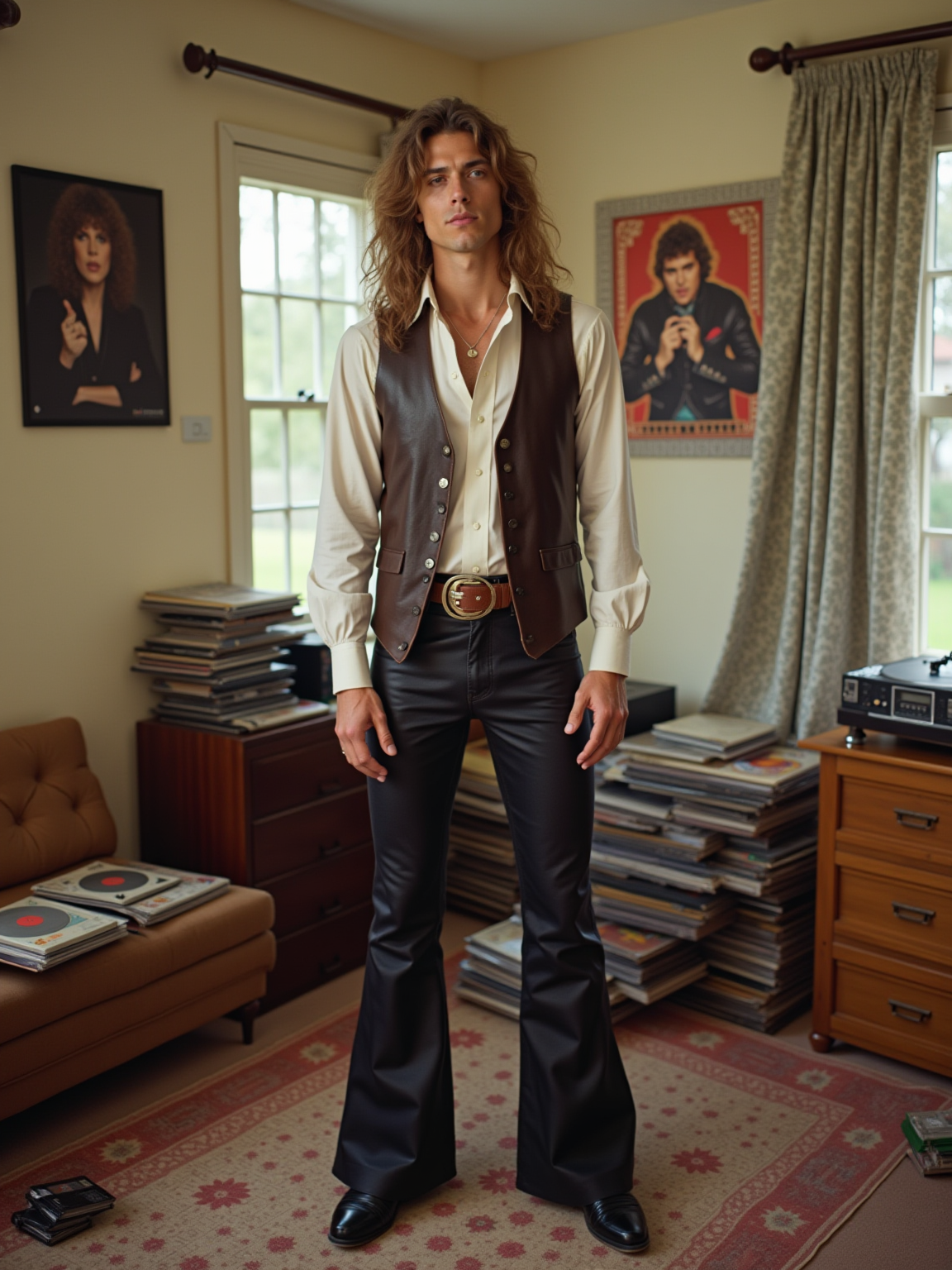 model in a typical 70s bedroom, wearing a wide-collar shirt with bell-bottom pants and leather vest, surrounded by scattered vinyl records and 8-track tapes, posters of 70s rock bands and disco stars on the walls, wood-grain stereo system with turntable in background