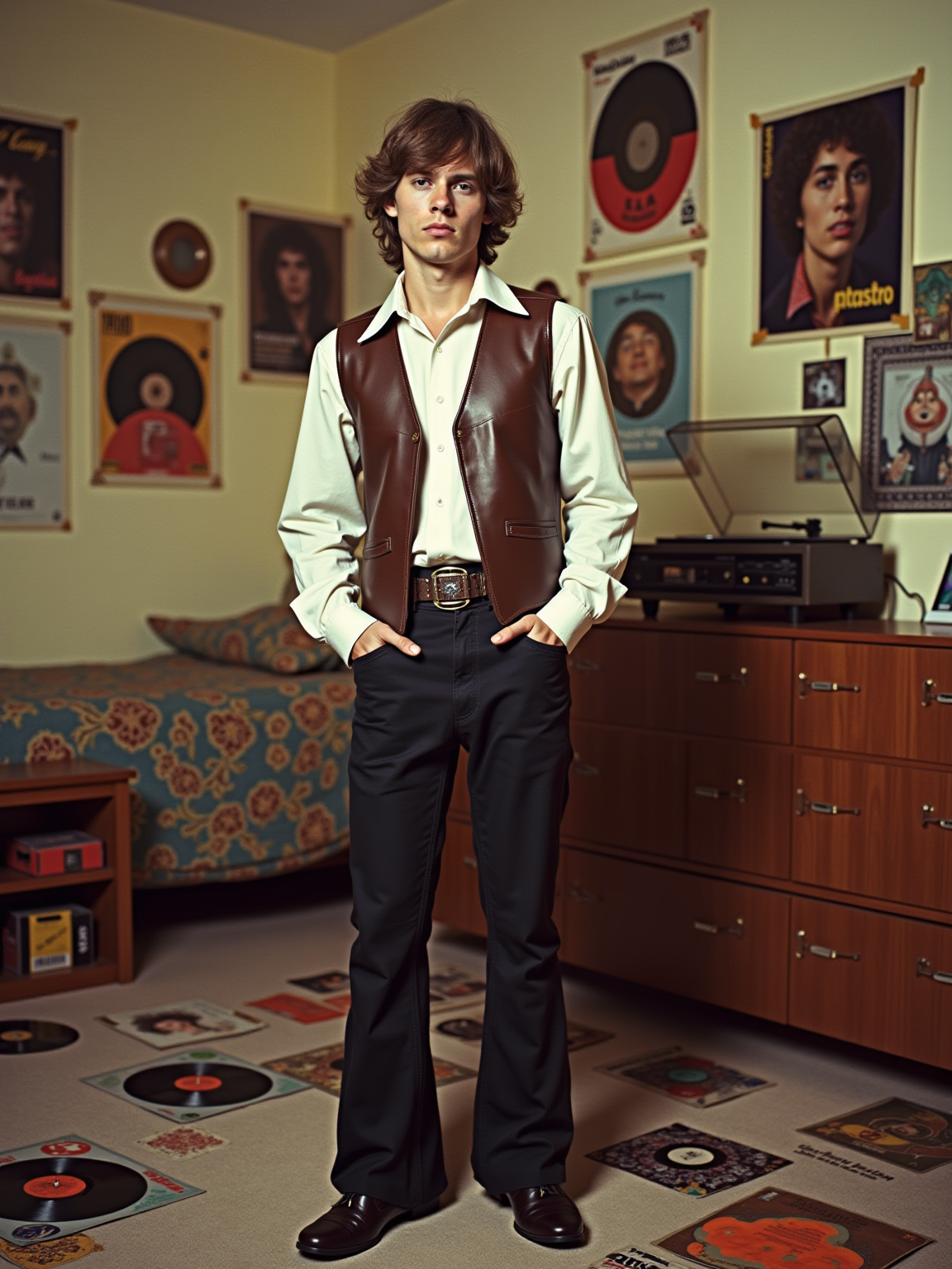 model in a typical 70s bedroom, wearing a wide-collar shirt with bell-bottom pants and leather vest, surrounded by scattered vinyl records and 8-track tapes, posters of 70s rock bands and disco stars on the walls, wood-grain stereo system with turntable in background