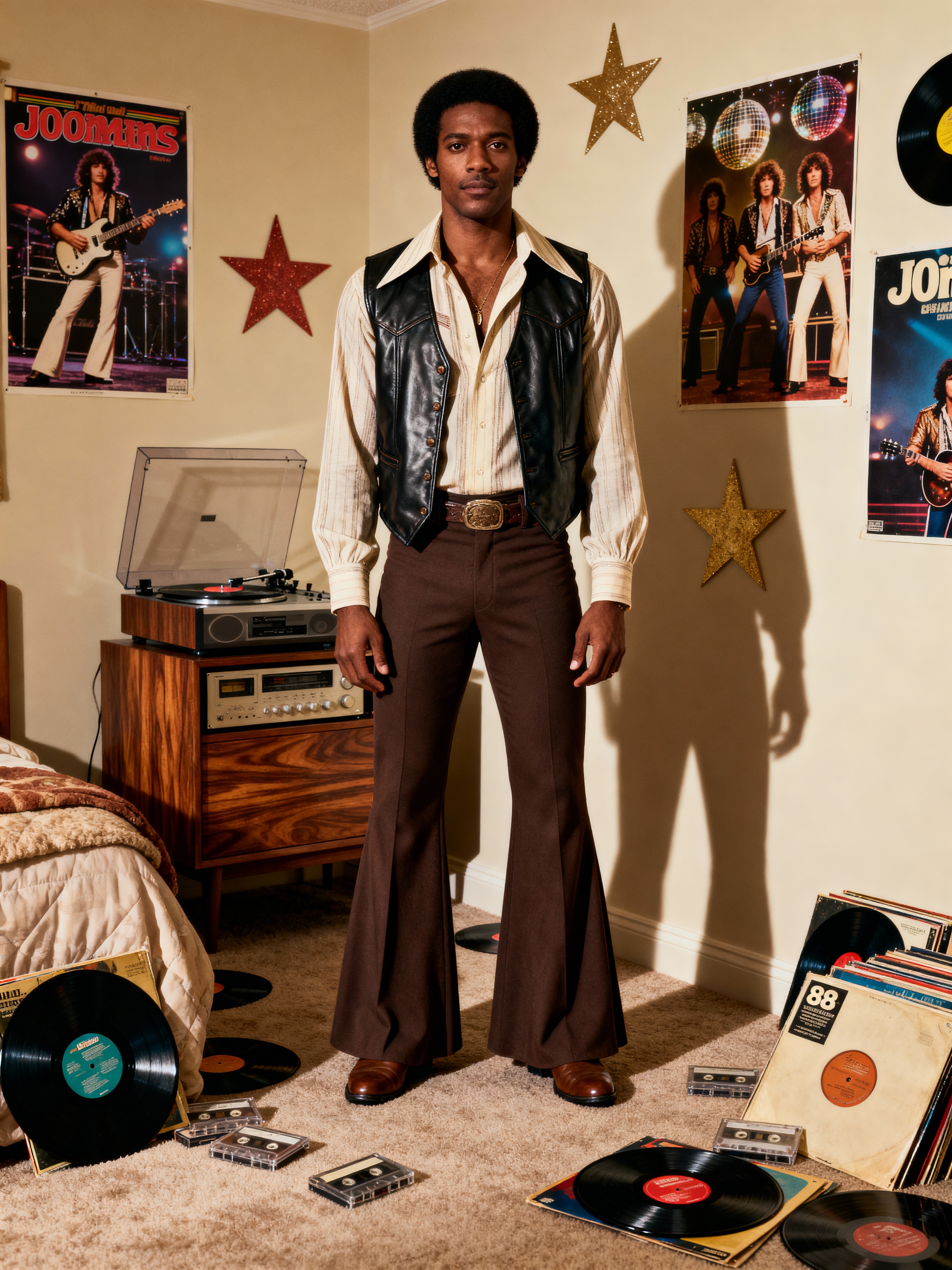 model in a typical 70s bedroom, wearing a wide-collar shirt with bell-bottom pants and leather vest, surrounded by scattered vinyl records and 8-track tapes, posters of 70s rock bands and disco stars on the walls, wood-grain stereo system with turntable in background