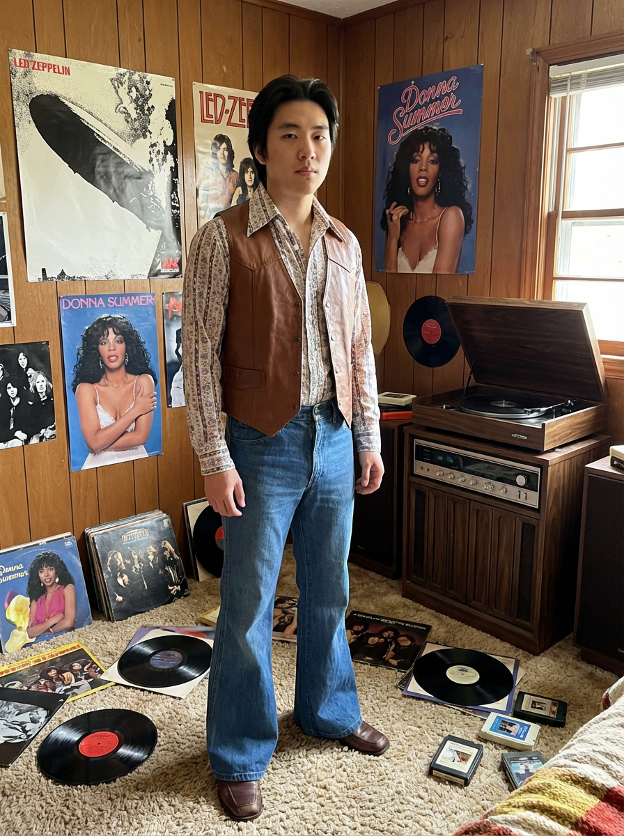 model in a typical 70s bedroom, wearing a wide-collar shirt with bell-bottom pants and leather vest, surrounded by scattered vinyl records and 8-track tapes, posters of 70s rock bands and disco stars on the walls, wood-grain stereo system with turntable in background