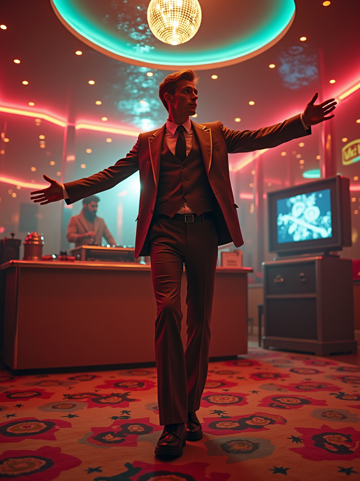 model in a typical 70s disco, wearing a three-piece suit with wide lapels and platform shoes, dancing under a spinning disco ball, neon lights reflecting off mirrored walls, vinyl records scattered around DJ booth, psychedelic carpet with wild patterns