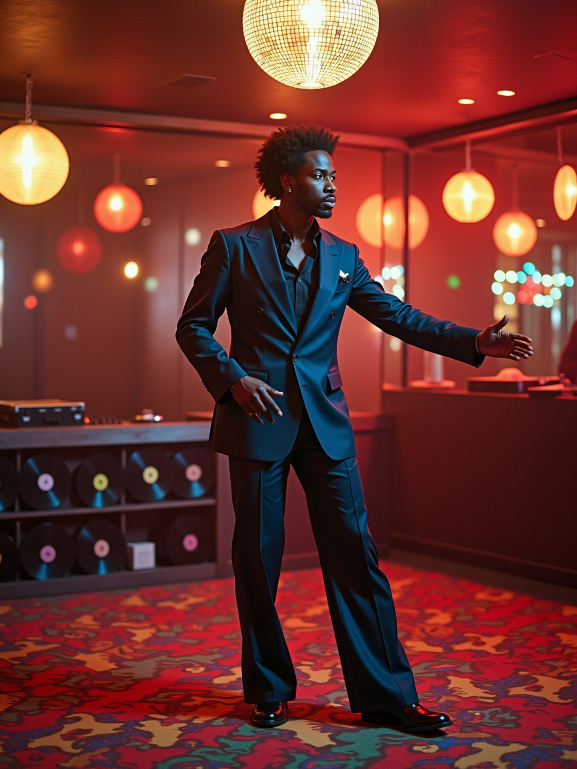 model in a typical 70s disco, wearing a three-piece suit with wide lapels and platform shoes, dancing under a spinning disco ball, neon lights reflecting off mirrored walls, vinyl records scattered around DJ booth, psychedelic carpet with wild patterns